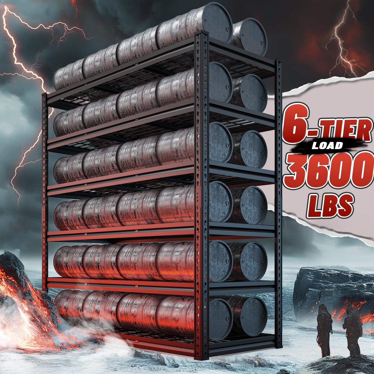 - 【3600LBS Capacity Storage Shelves Heavy Duty】The REIBII Garage Shelving is made of high-quality steel material.Each sturdy shelf layer can hold up to 600 pounds for a total carrying capacity of 3600 LBS.The metal shelving has 2 support rods and 4 stiffeners to avoid heavy deformation and bending of this storage shelf