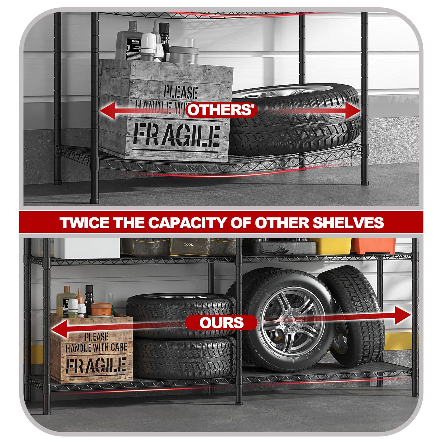 - 【1430 LBS Capacity Super Sturdy Storage Shelving Storage Rack】This Metal shelves for storage made of heavy duty steel wire,and has undergone special coating treatment.Every solid thickened shelving with extra stiffener,can easily bear 286LBS a total of 1430 lbs bearing capacity .which means this metal shelving unit will always be your reliable partner.