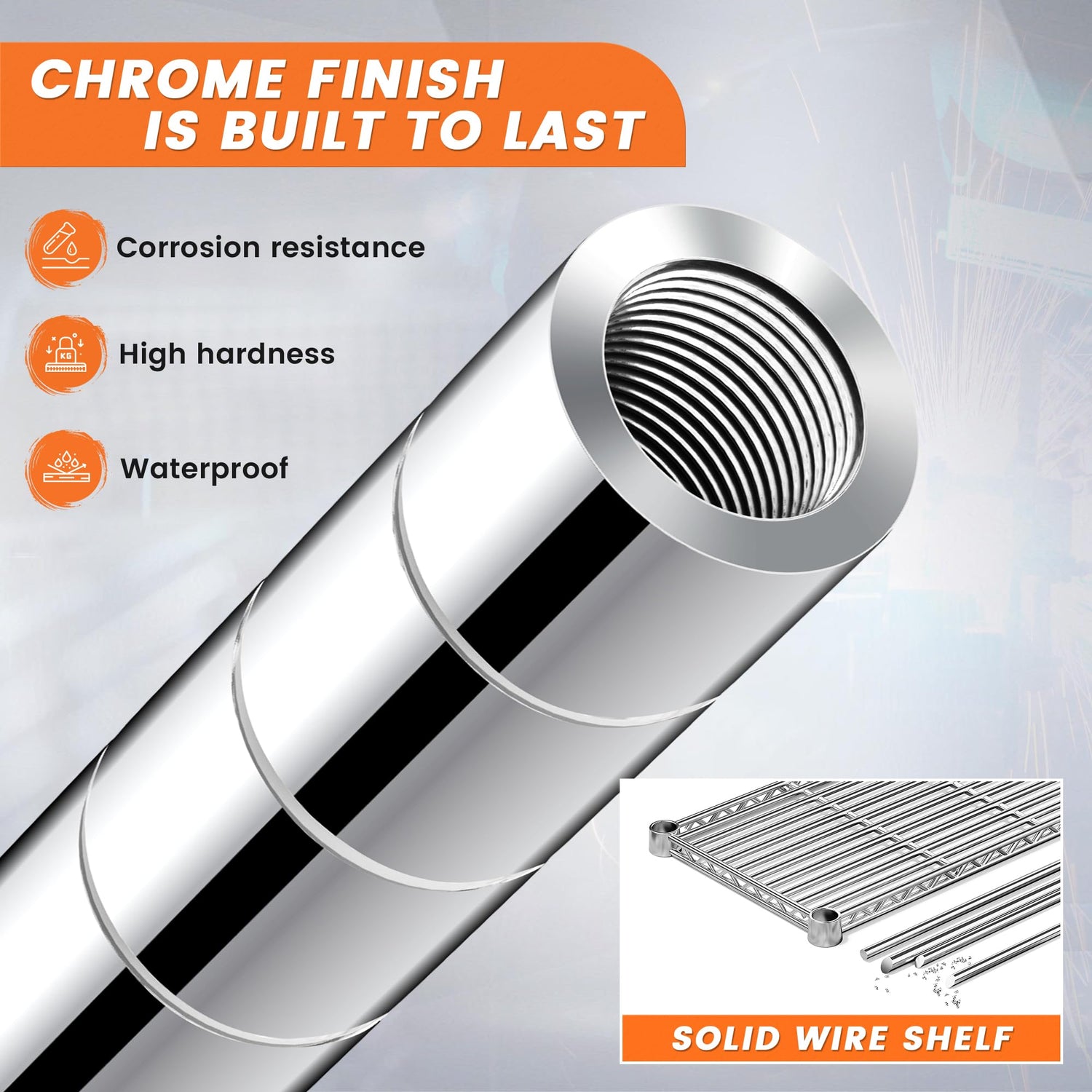 - 【Wire Shelf with chrome finish-Durable and rustproof 】Industrial-strength steel made this garage shelves,and adopts a unique chrome plating process, which not only ensures its sturdy and rust prevention, moisture resistance, corrosion resistance, but also has a beautiful appearance.Also, the garage shelves made of These metal shelving for storage are built to last That is best choice to place the shelving units and storage in your kitchen or bathroom