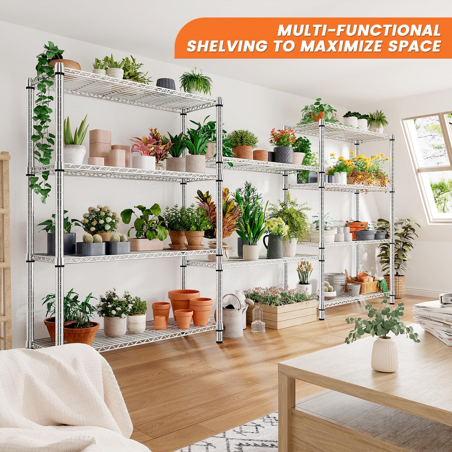 - 【1200LBS Capacity Super Sturdy Storage Shelves 】 Industrial-strength steel wire with chrome finish and 19.1 mm diameter metal rods made this wire shelving.Each panel is reinforced at the bottom for extra strength,it ensures that this metal shelves holds 240 LBS per tier and 1200 LBS overall!These wire racks for all of your home organization or commercial shelving needs