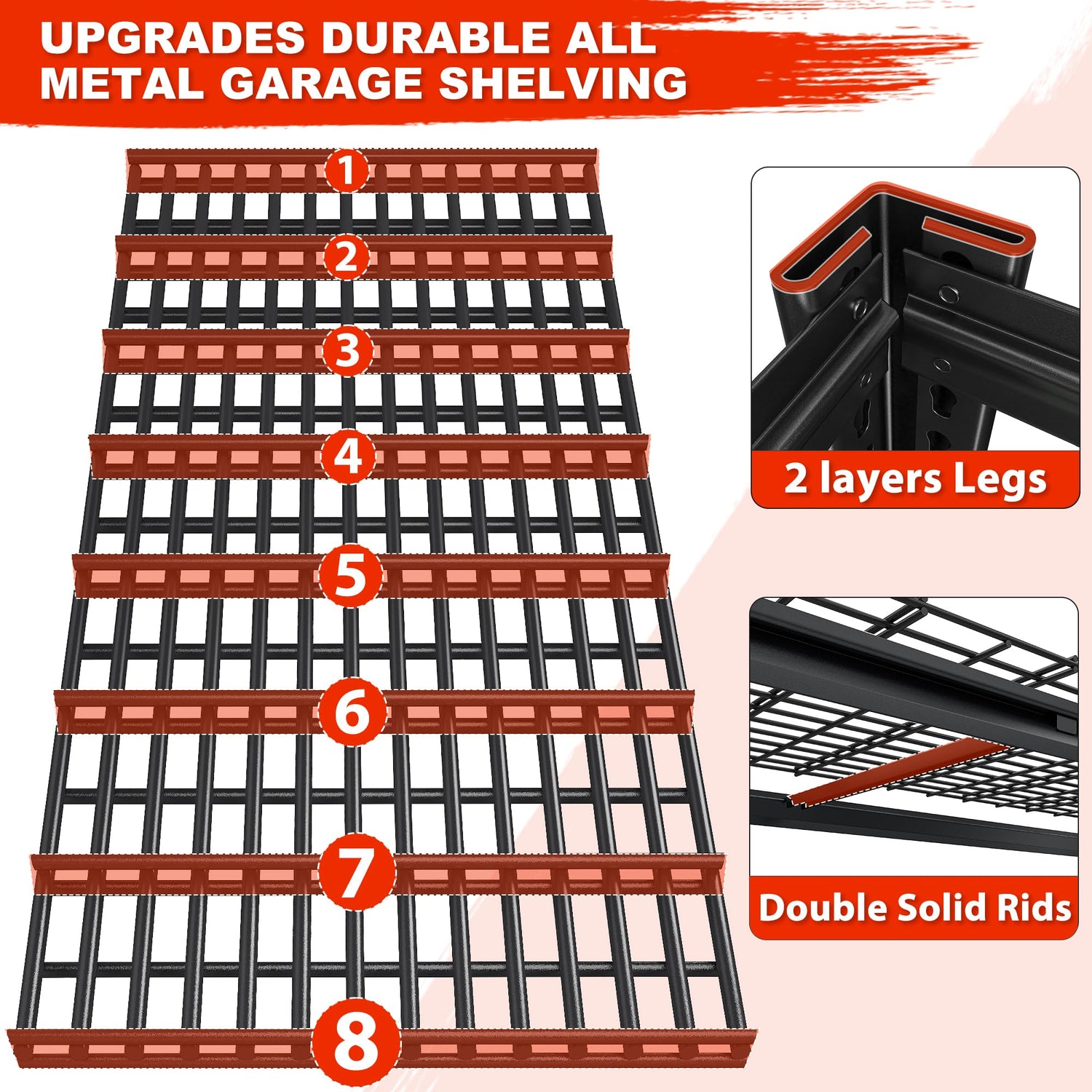 - 【3000LBS Capacity Heavy Duty Garage Storage Shelves】REIBII heavy duty shelving unit has thickened double metal legs. Made of high-quality metal, each solid thickened metal shelving with 8 big ribs beneath can hold up to 600 lbs, with a total bearing capacity of 3000 lbs, which makes industrial garage shelves heavy duty more stable and solid than normal metal shelves for storage, and more stuff can be stored