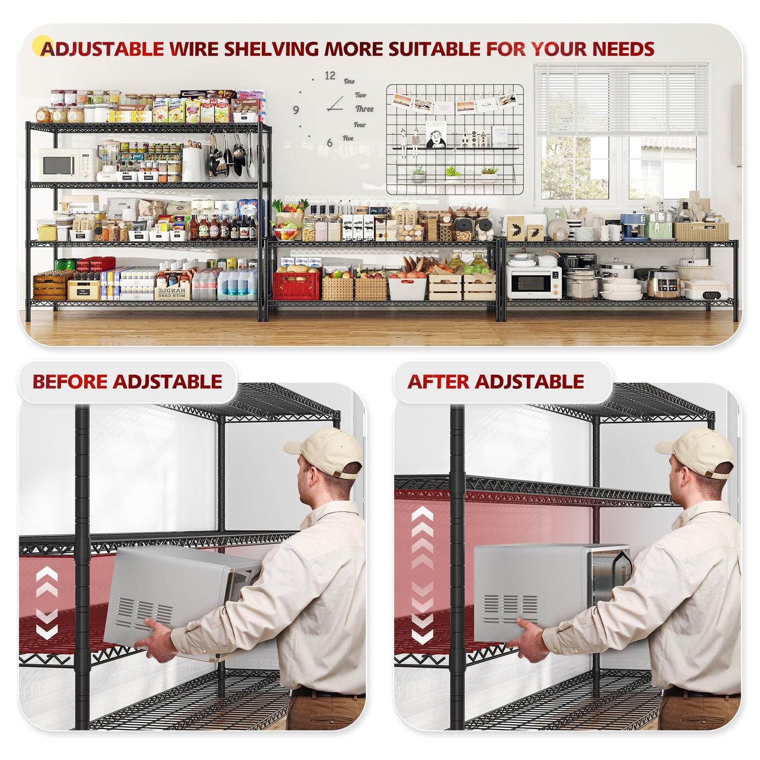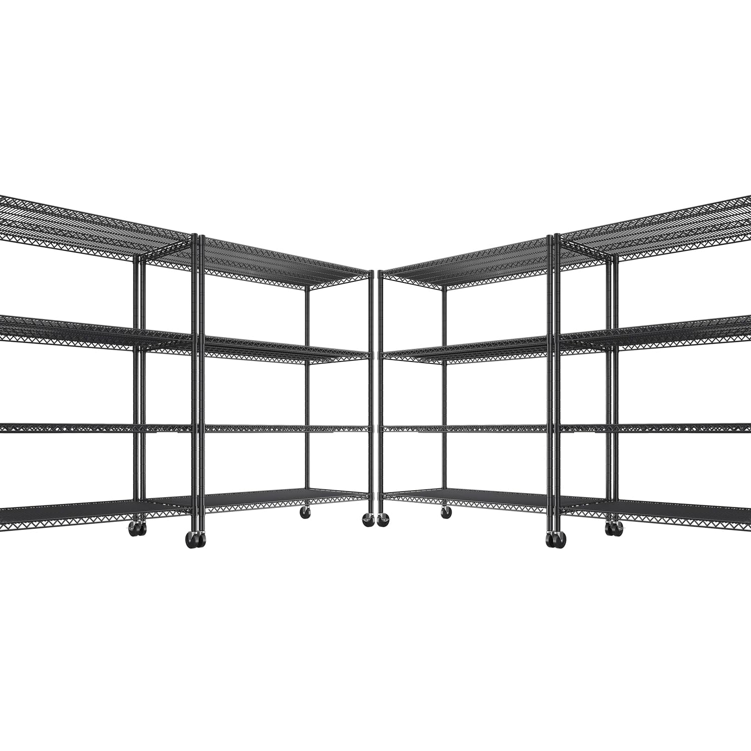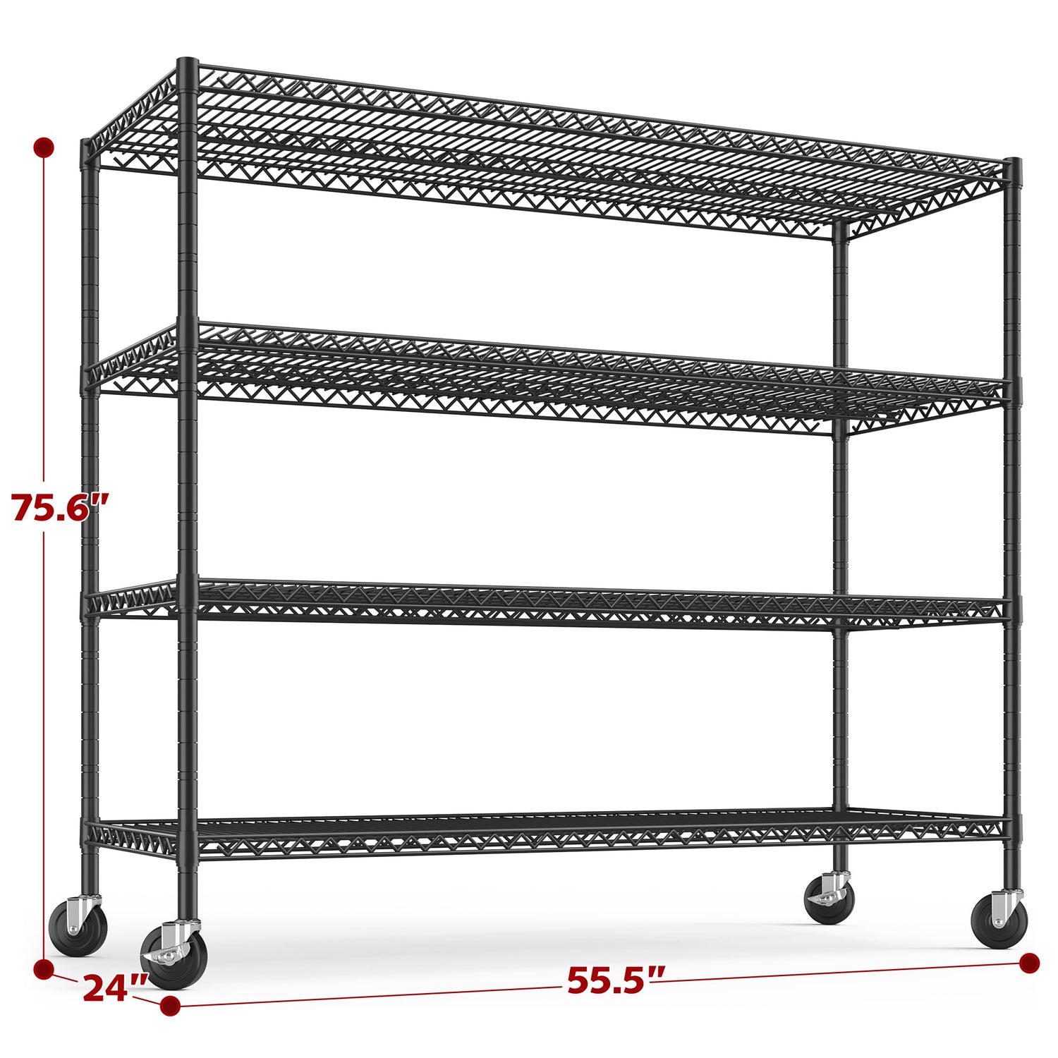 - 【Large Storage Space Wide Metal Shelves】The size of wire shelf storage rack on wheels is 75.6"H X 55.5"W X 24"D. The capacity of wire shelving is twice that of the market shelves, easily meeting your storage needs.The 4 tier metal shelf unit not only expands your storage space, makes your home clean and orderly, is your best choice.The metal storage rack can be placed in kitchens, bathrooms, rooms, living rooms, warehouses, offices, commercial exhibitions, hotels, supermarkets, etc;