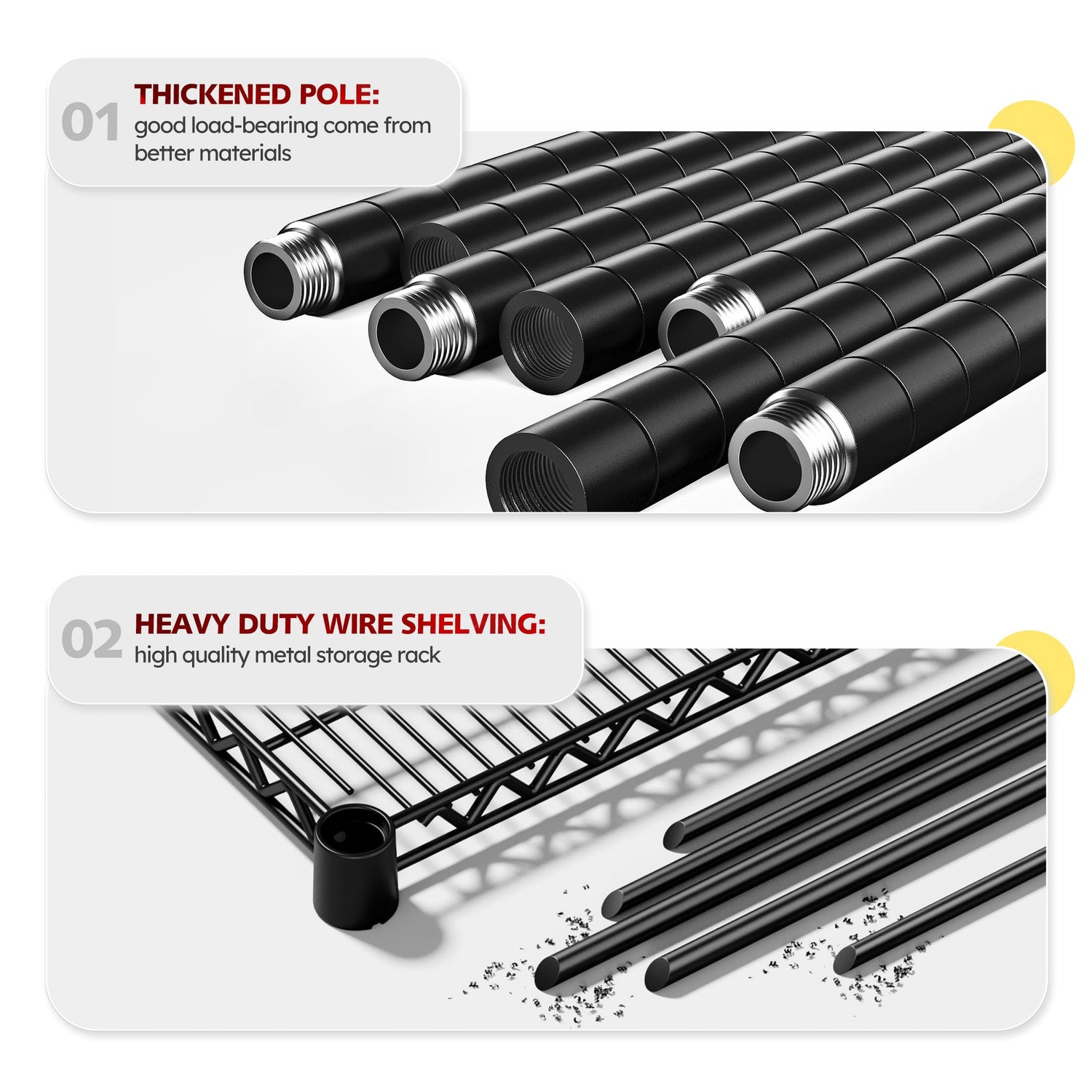 - 【2500LBS Capacity Heavy Duty Metal Shelving Unit 】The storage shelves is made of sturdy heavy duty steel wire and 25.4 mm diameter metal rods. Each solid thickened metal shelves for storage with extra support ribs beneath can hold up to 600 lbs on leveling feet, with a total bearing capacity of 2500 lbs on leveling feet(800lbs on wheels).