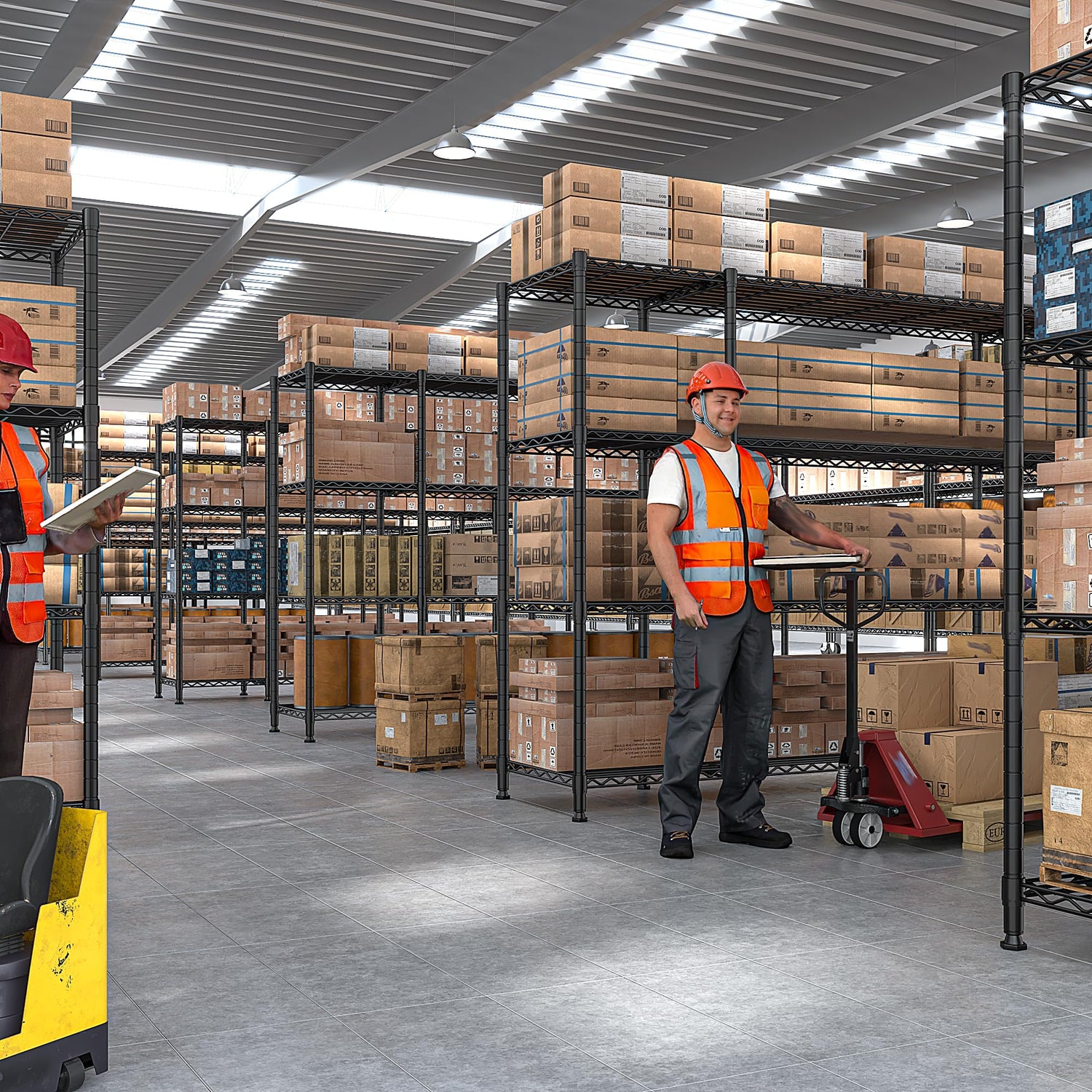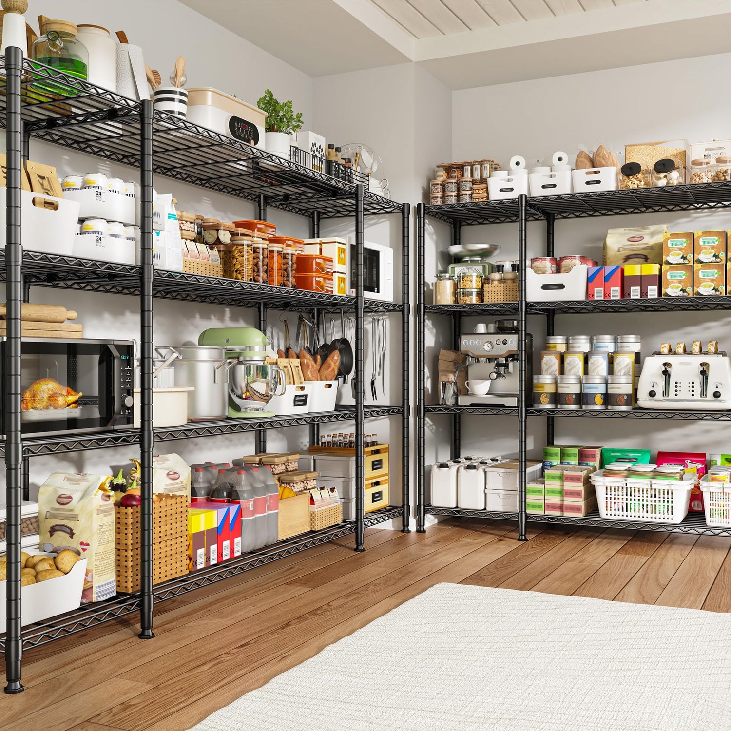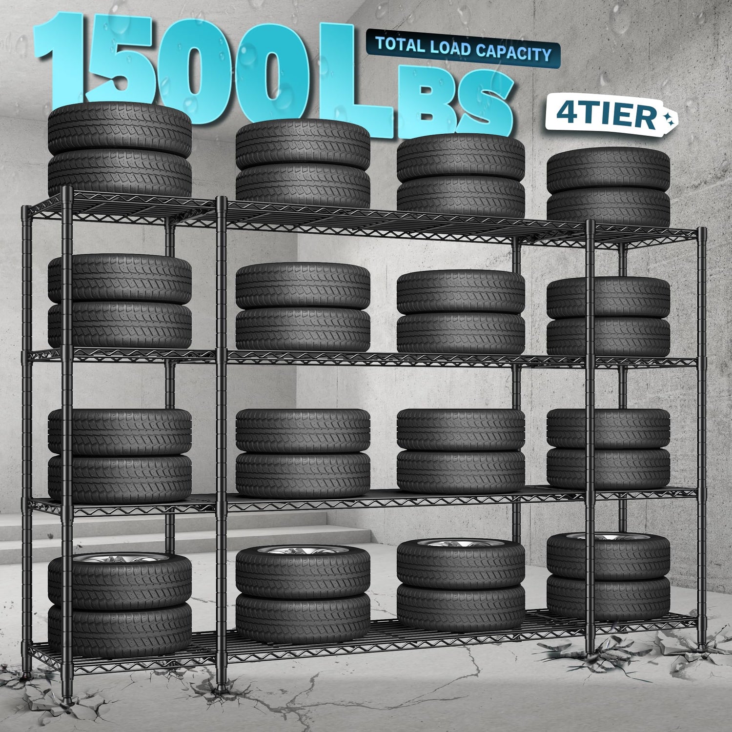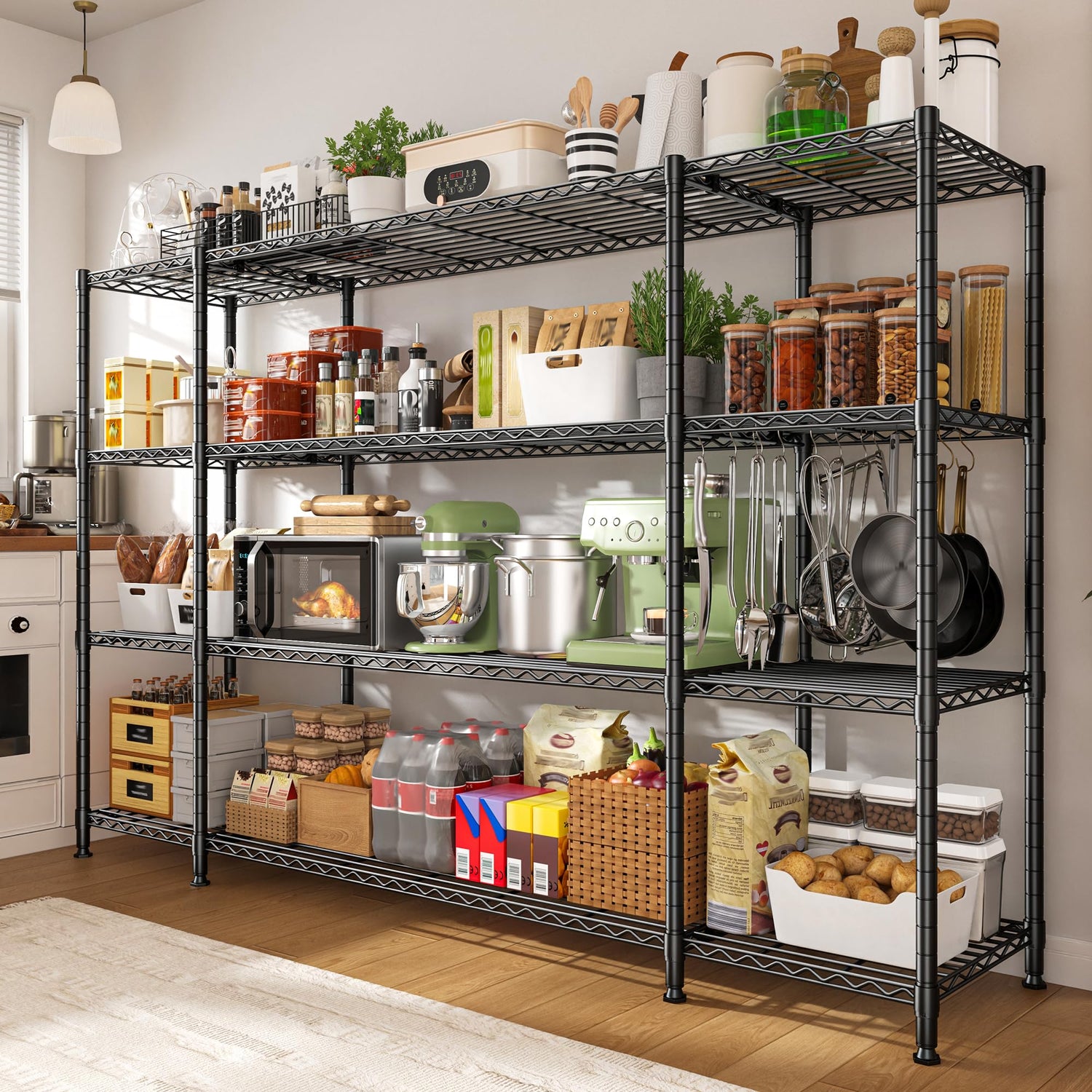 - 【1500LBS Heavy Duty Storage Shelves】 Our heavy-duty shelves are made of sturdy carbon steel and 19mm metal rods, with a total load-bearing capacity of 1500 pounds. And it adopts a powder-coated surface, which is waterproof and can be used for a longer time. It is an ideal choice for garage, kitchen, basement and warehouse supplies.