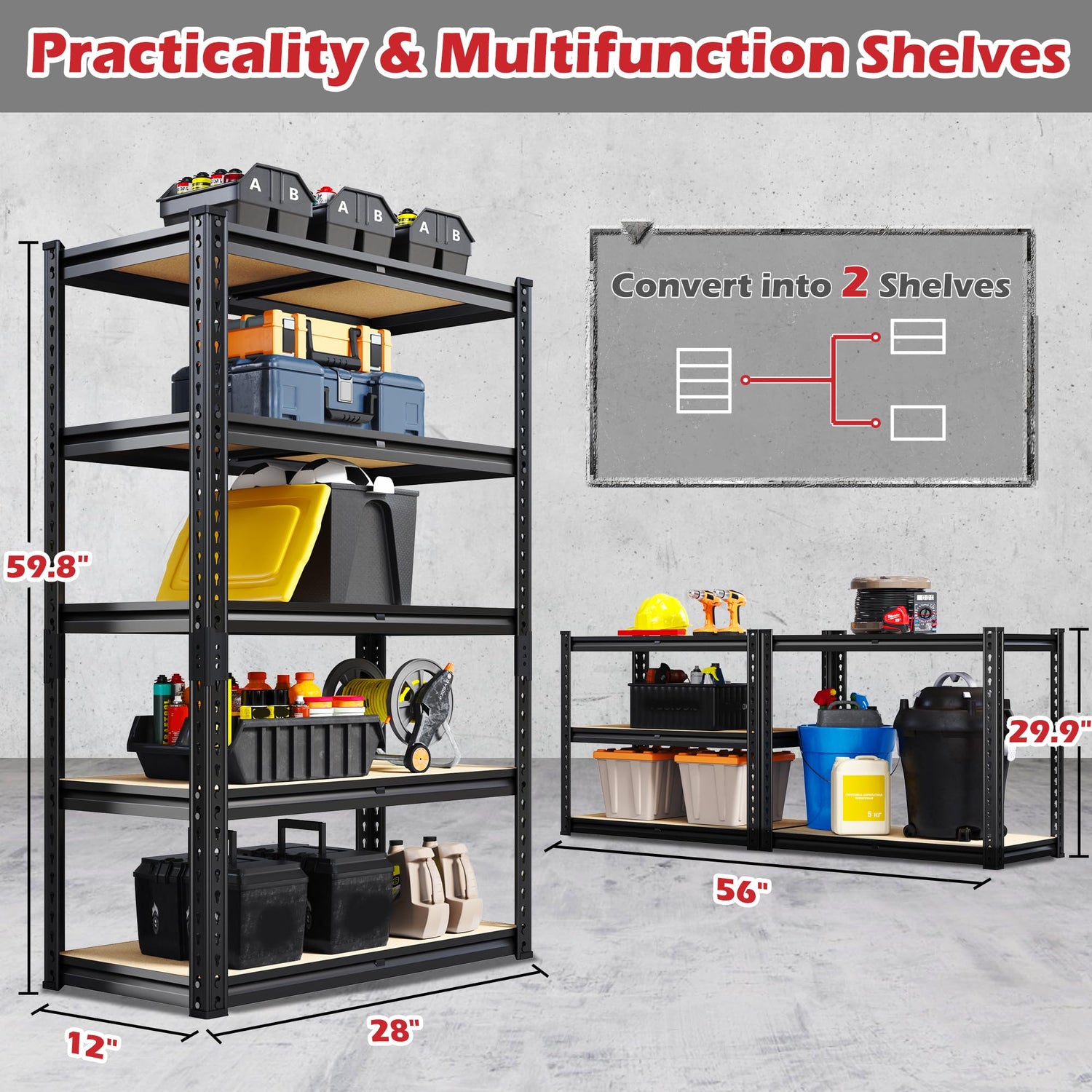 - 【28 "W x 59.8"H x 12"D storage shelves】The shelving units and storage are 28"W x 12"D x 59.8"H,This metal shelving is suitable for Living room, kitchen, bedroom, utility room, pantry, garage, warehouse, basement, warehouse, supermarkets, offices and etc