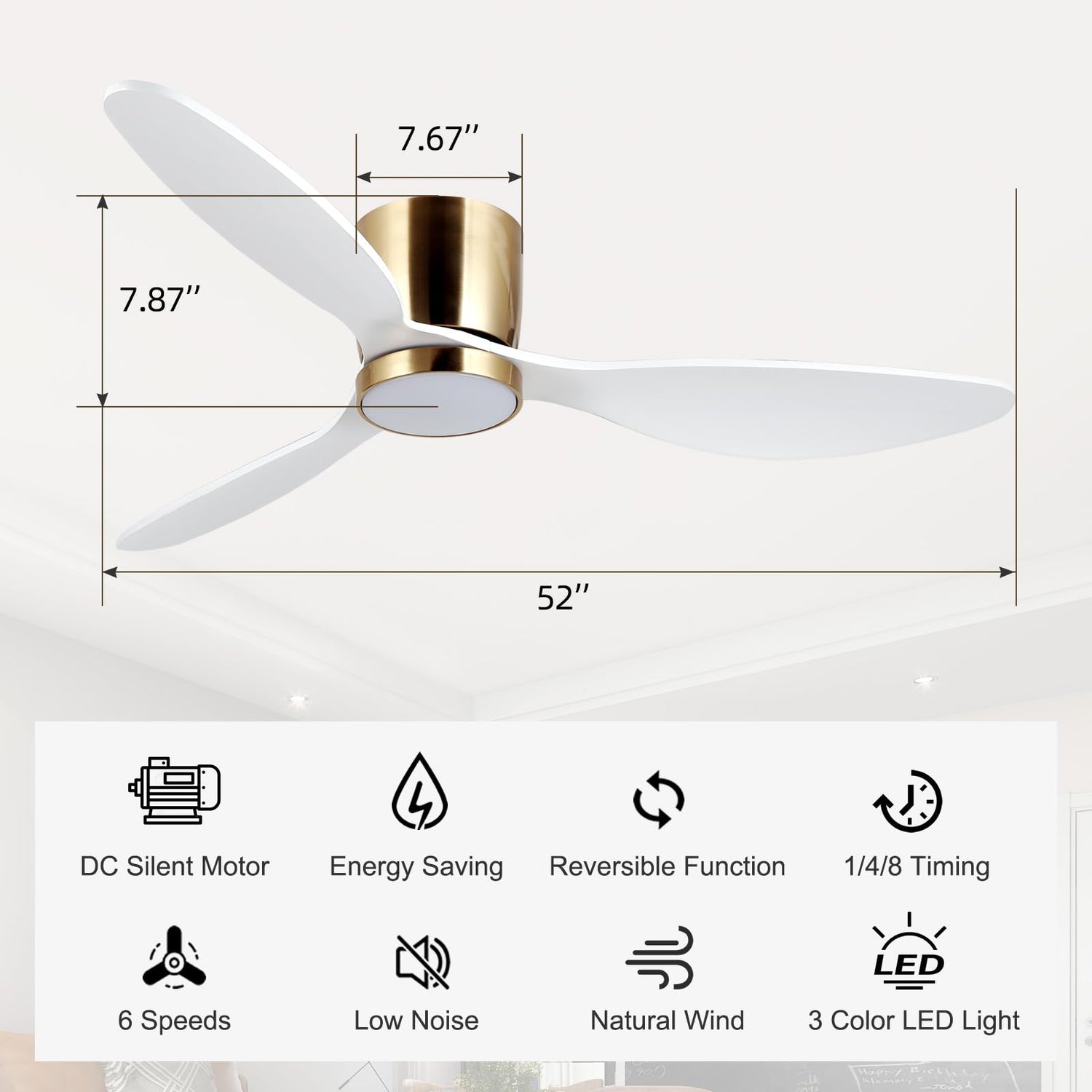 reiga 52 Inch Flush Mount White Ceiling Fan with Light Remote Control, Quiet DC Motor Low Profile 3 Wood Blade Modern Ceiling Fans for Patio Kitchen Living Room Bedroom