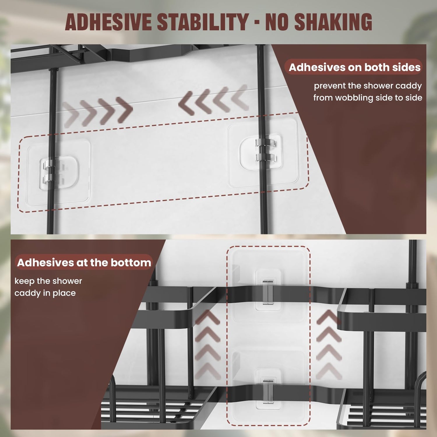 - 【TOOL-FREE INSTALLATION】No drilling or tools are needed to install the shower caddy. The U-shaped rubber locks the shower caddy tightly onto showerheads, while strong adhesive stickers prevent the shower caddy from swaying. Even when fully loaded, the shower organizer stays firmly in place, eliminating spills during showers.