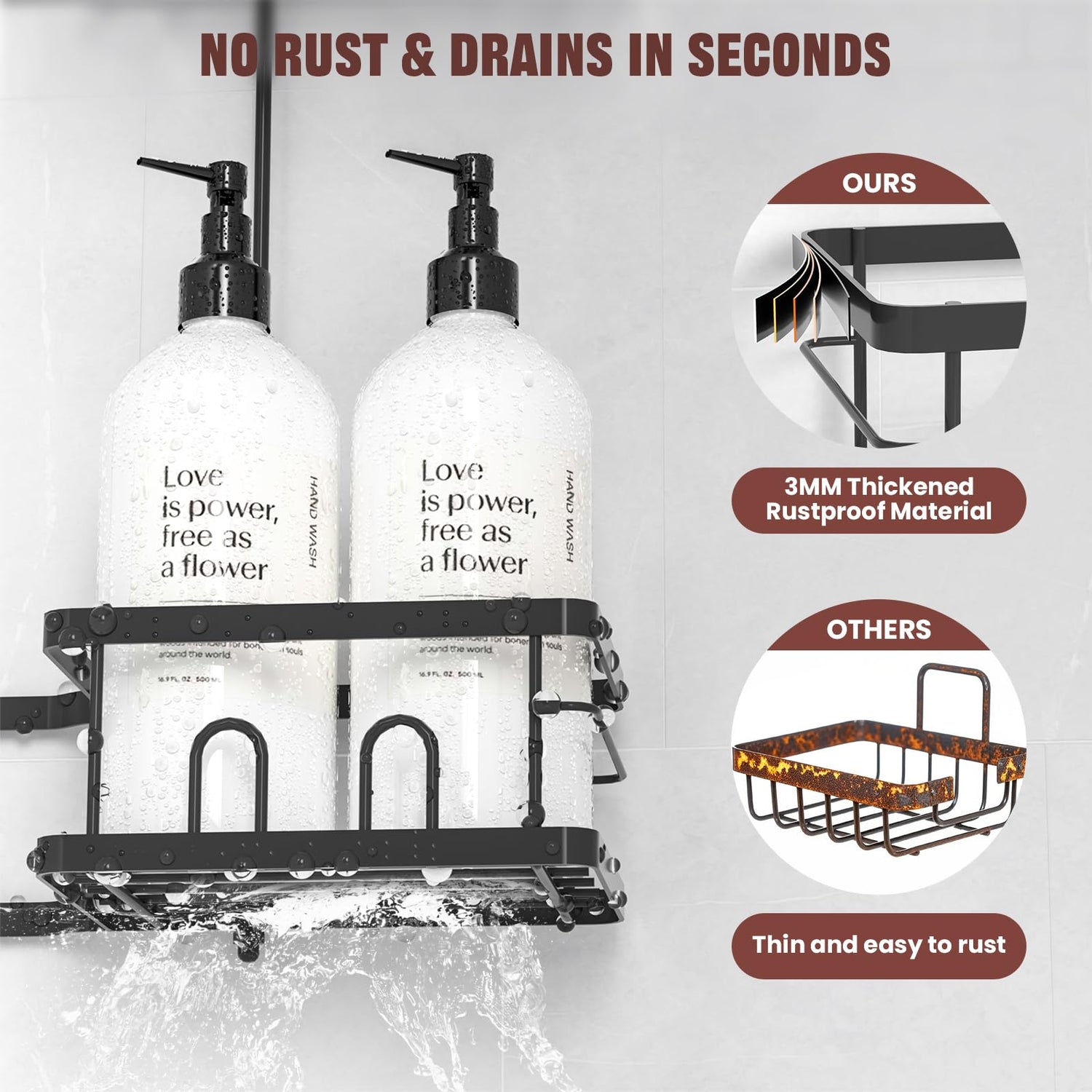 - 【RUSTPROOF & DURABLE】Constructed with stainless steel and rustproof coatings, the shower caddy over shower head resists corrosion in humid environments. All baskets with quick-drain holes prevent water accumulation, and the reinforced frame of the shower caddy supports up to 40 lbs weight.
