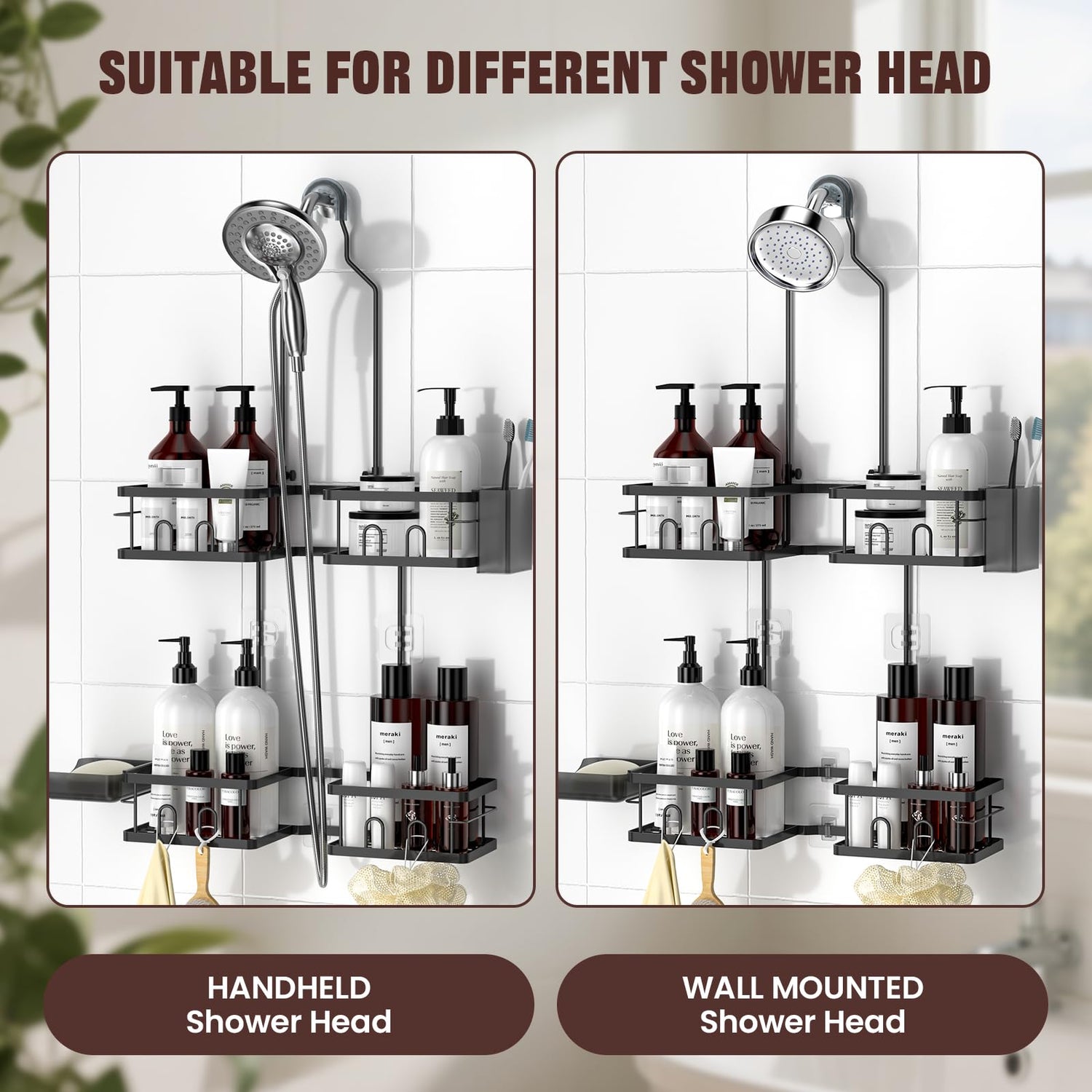 - 【FIT HANDHELD SHOWERHEAD】Upgraded hanging shower caddy is compatible with most wall-mounted or handheld showerheads. Designed with the split-center shape, the shower organizer lets hoses hang freely without interfering when using the shower essentials.