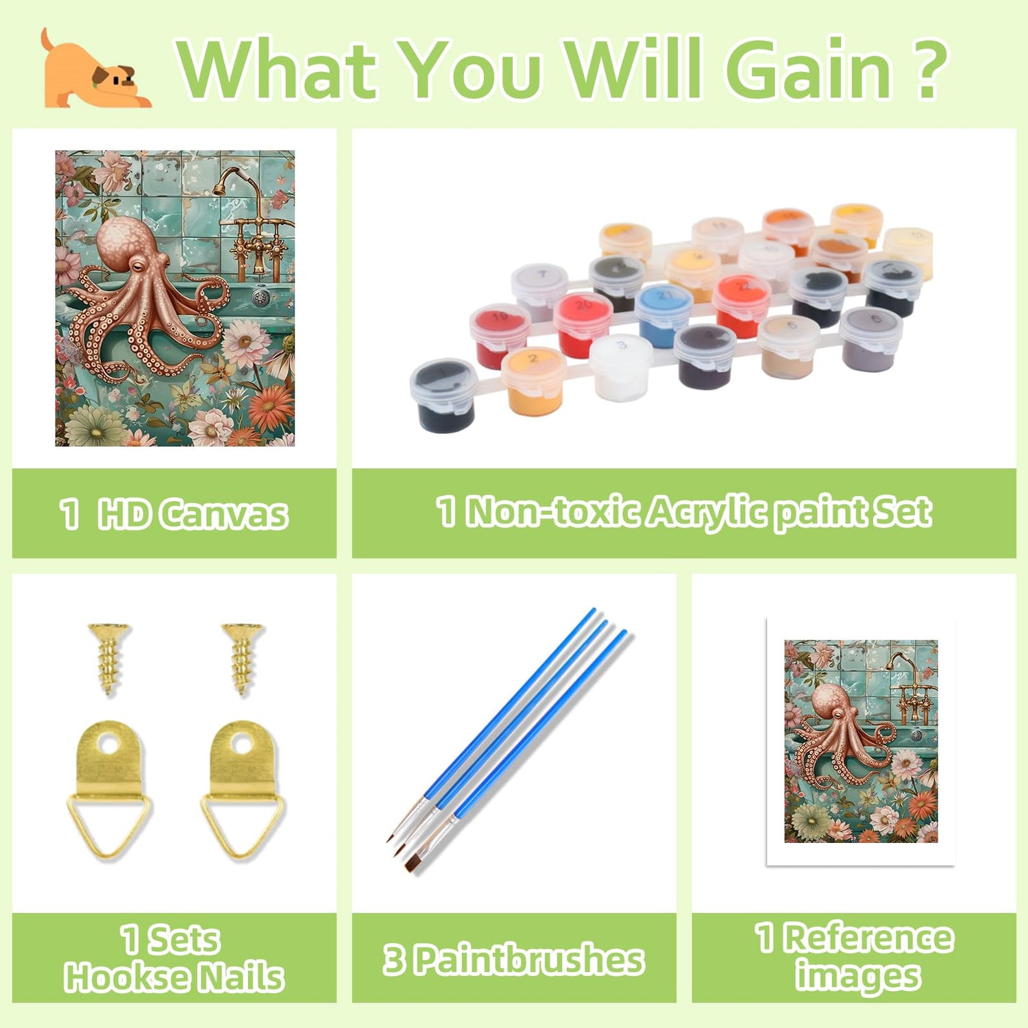 The kit includes 1 waterproof canvas, 1 instruction sheet and line drawing, 1 set of acrylic paints, 3 paintbrushes, 1 set of hooks. The canvas is marked with numbers that correspond to the colors of paint that should be applied in those areas, making the painting process straightforward and convenient.