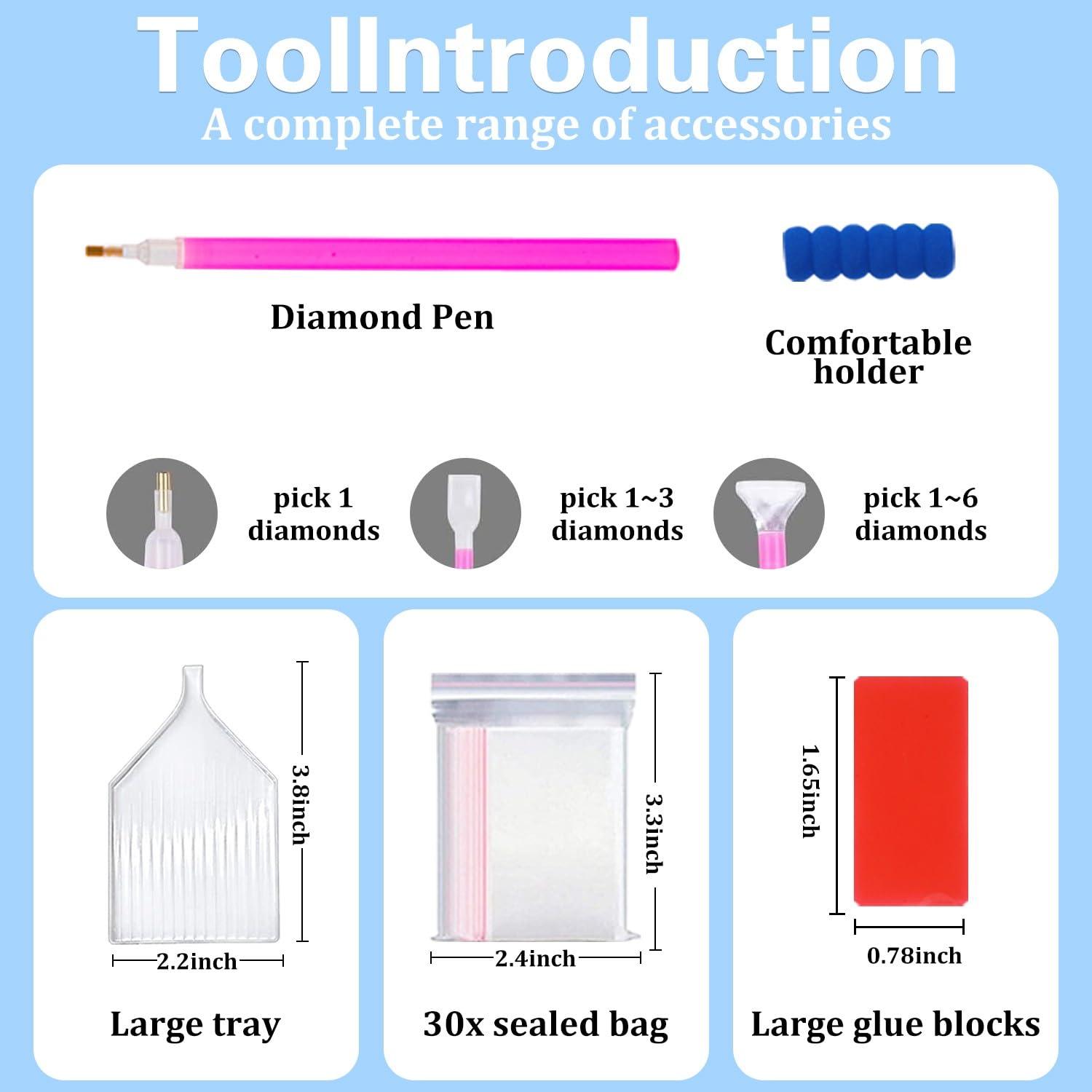 - [What You Will Receive]: With the purchase of diamond art kits for adults you will get: 1 waterproof canvas, 1 diamond bag, 1 drill pen, 2 replacement pen tips, 1 big glue block, 1 tray, 30 ziplock bags and 30% extra diamonds.