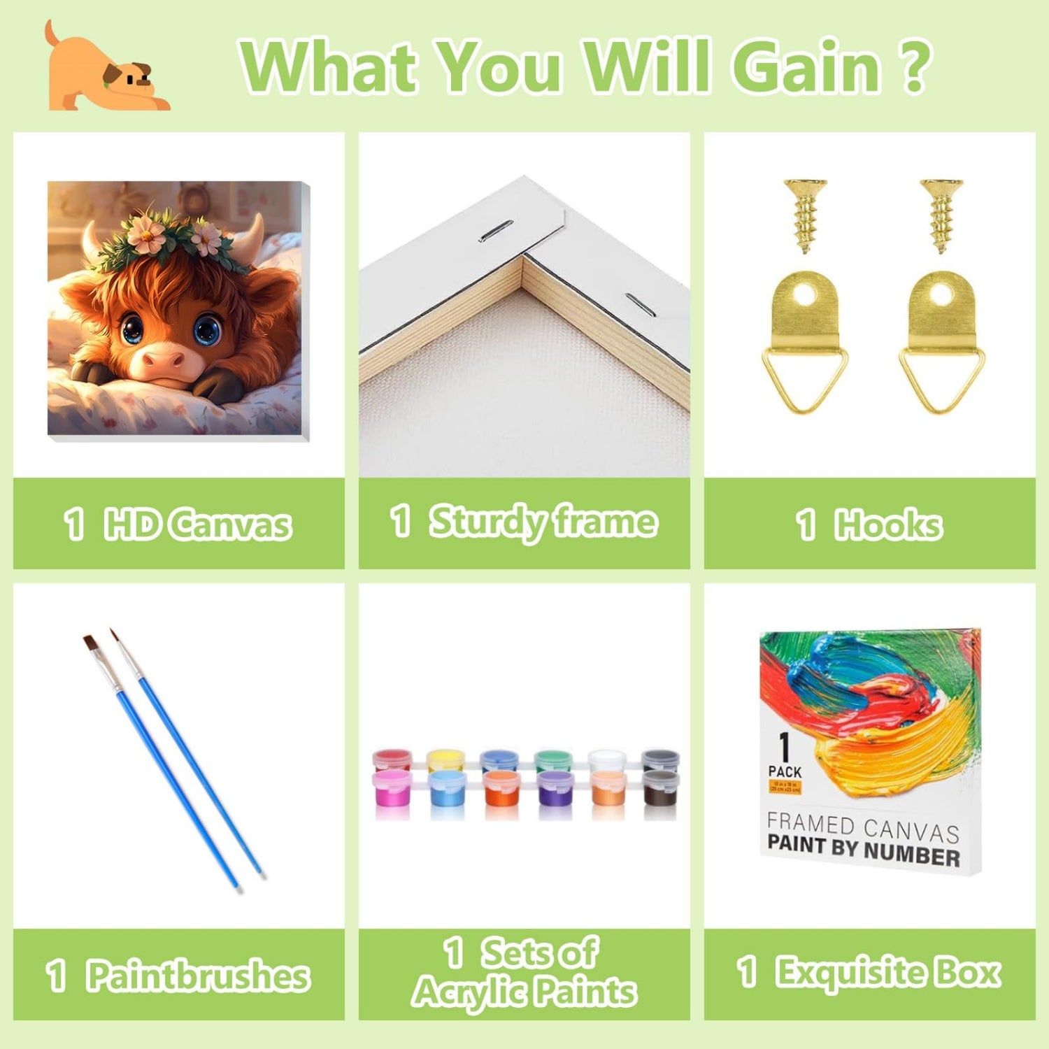 Reivworl Paint by Numbers Kit for Kids with Frame and Easel, Cow Paint by Number Kids Age 5-8-12, Paint by Numbers Gifts and Home Decor - 8X8 Inch