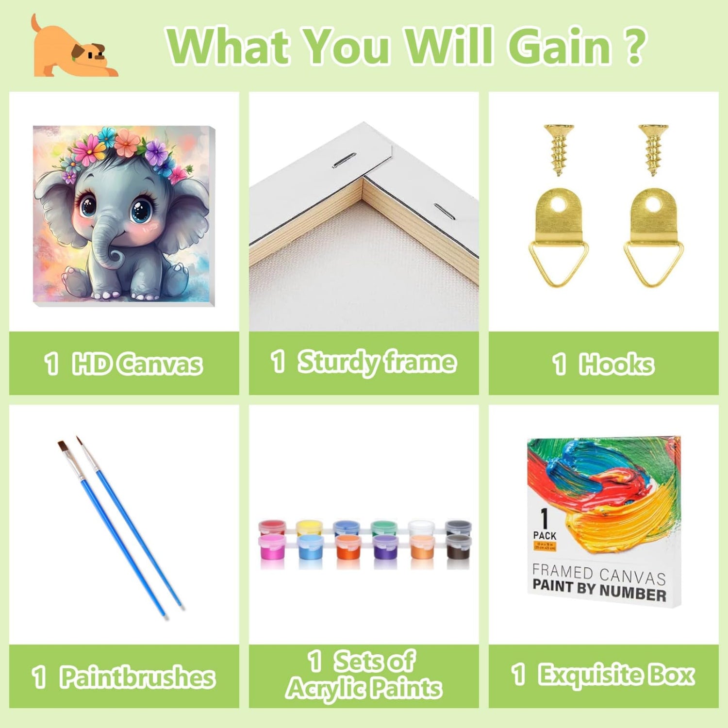 - [What Will You Get?]: Paint by numbers kit for kids includes: 1 framed colored printed canvas, 1 colorful box, 1 easel, 2 nylon brushes (in different sizes), 1 reference image, 2 hooks, and sufficient paint.