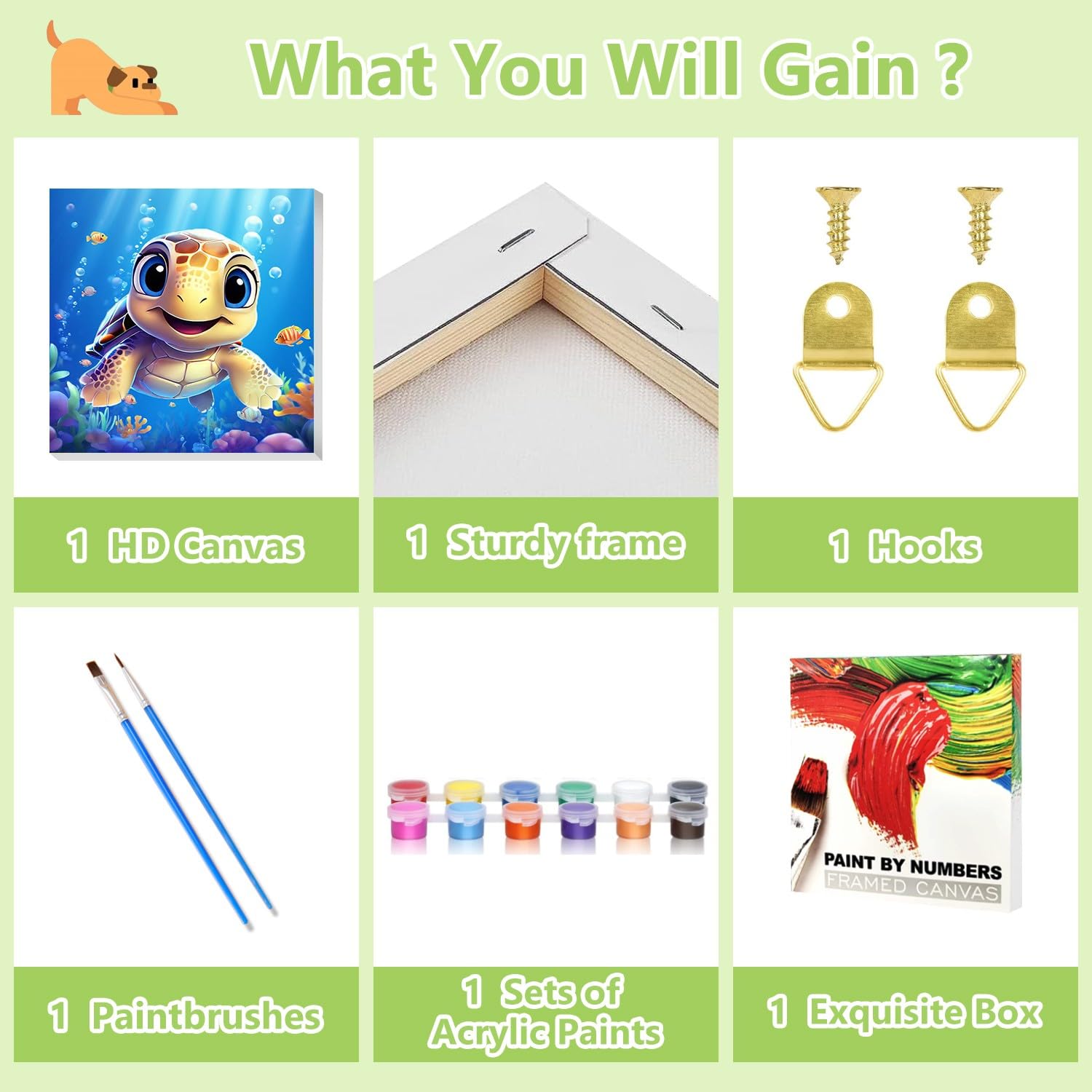 - [Paint by Numbers Kit for Kids]: Paint by number kids, comes with 1 framed canvas, 2 nylon brushes, 1 color guide, enough color matching and hooks, the set contains enough tools to show your painting skills.