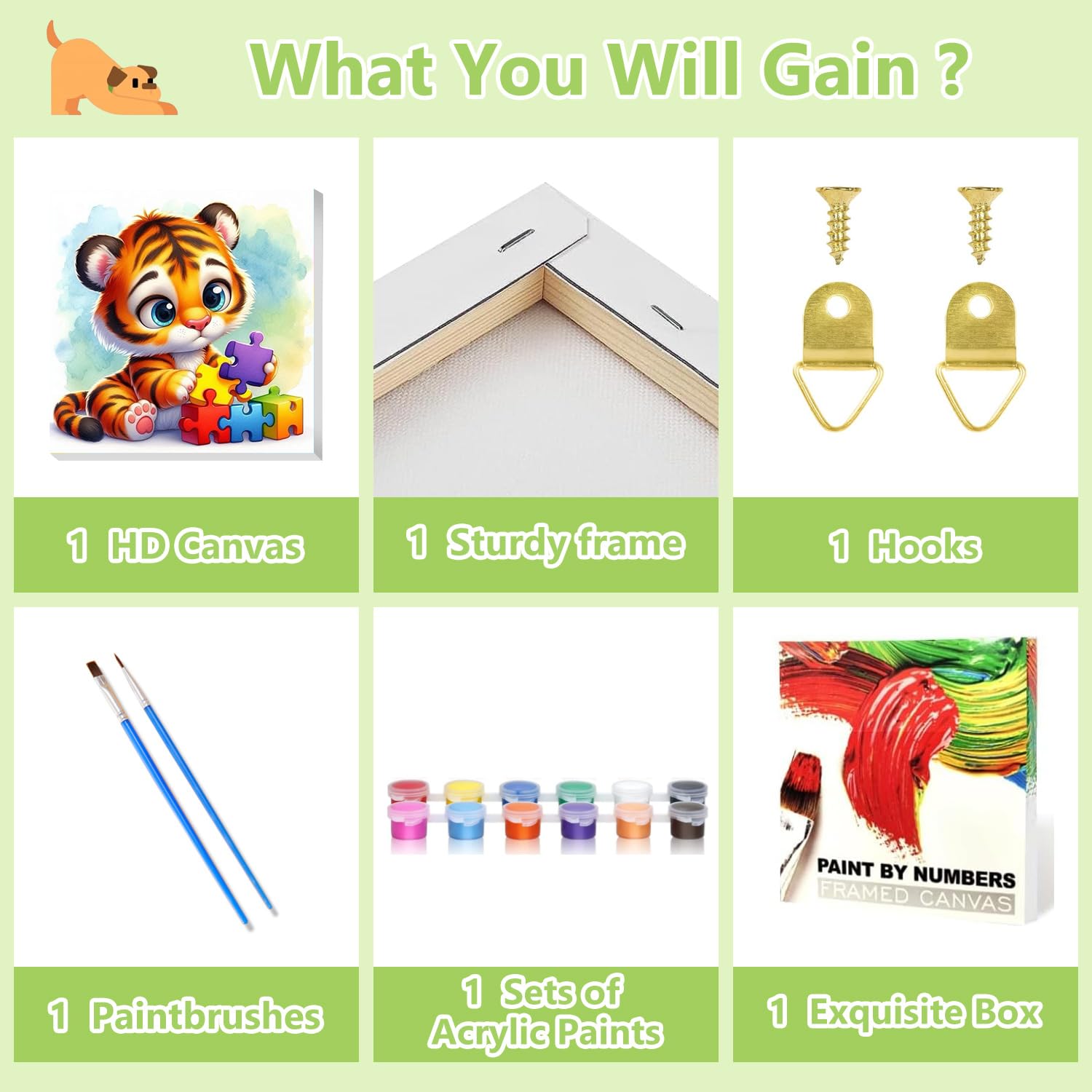 - [What Will You Get?]: Paint by numbers kit for kids includes: 1 framed colored printed canvas, 1 colorful box, 1 easel, 2 nylon brushes (in different sizes), 1 reference image, 2 hooks, and sufficient paint.
