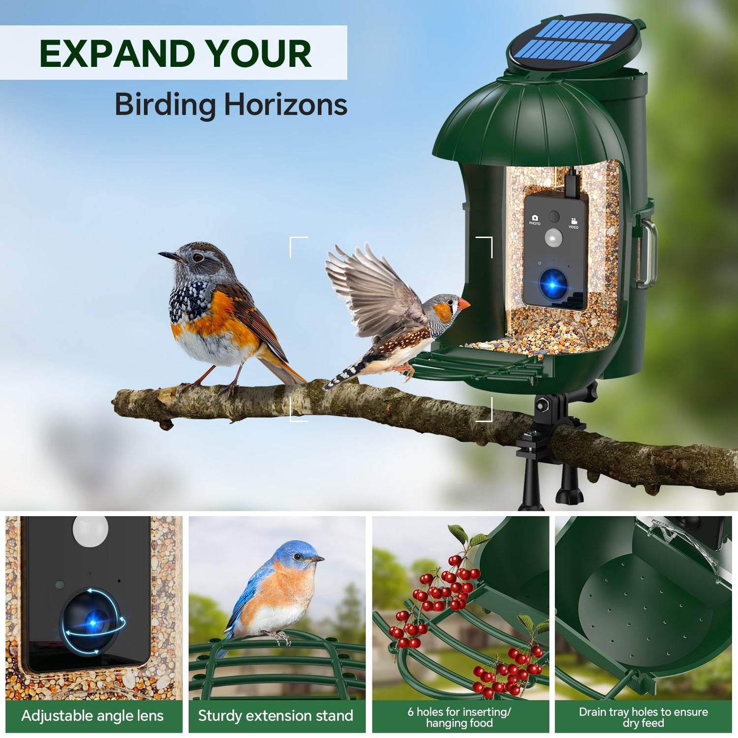 Relassy Bird Feeder with Camera, Waterproof Smart Bird Feeder with Camera Solar Powered for Outdoors, Rechargeable & Detachable 110° Bird Feeder Camera, Auto Capture Bird HD Videos & Photos, Green