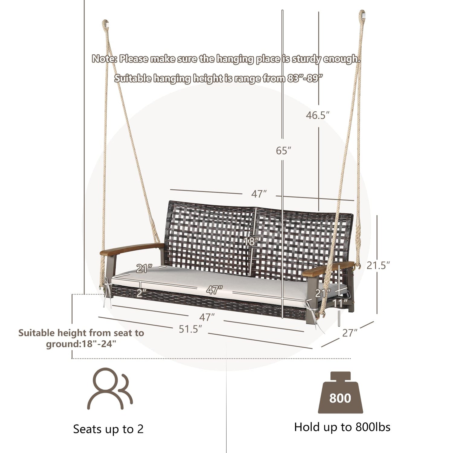 The outdoor hanging swing bench features a large seat for 2 people. The 118” long hanging ropes with solid hooks ensure firm connection and the maximum weight capacity is 800 lbs. You can sit and swing cozily because of the soft padded cushion and curved acacia wood armrests. The fixing straps can keep the cushion in place and prevent slipping. Meanwhile, the smooth zipper design makes cleaning easier by removing the cover. Additionally, the selected materials, durable PE rattan and strong metal, promise long-term use. You can enjoy the outdoor leisure time with your loved one in the backyard, garden or poolside.
