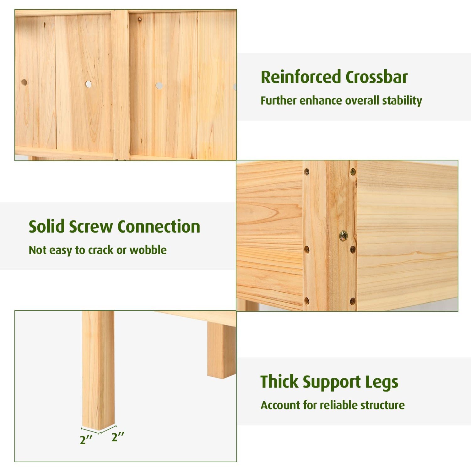 Features: 2 tier large planter box ideal for grow different plants Equipped with 8 drain holes to promote water drainage Selected fir wood is waterproof and durable for long-term use Thickened wooden legs enhance the overall stability Elevated design prevent animals damage your plants Compact design suitable for many spaces Easy to assemble with clear instruction manual