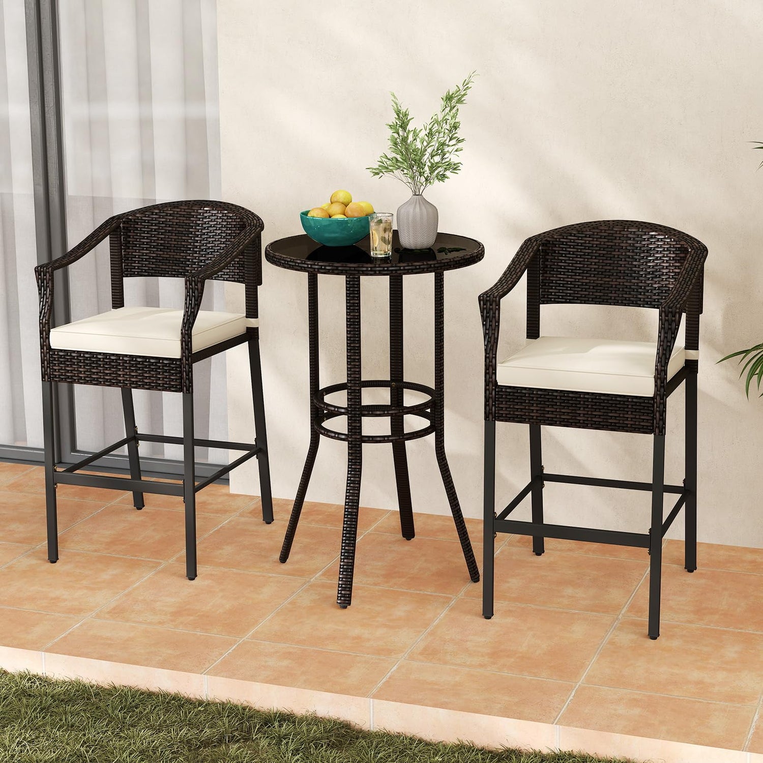 RELAX4LIFE 3-Piece Outdoor Bar Set - Patio Wicker Rattan Bar Height Barstools w/Cushions, Footrest, Round Glass Top Table, High Top Bistro Table & Chairs Set of 2 for Pool Porch Balcony (Brown-Beige)