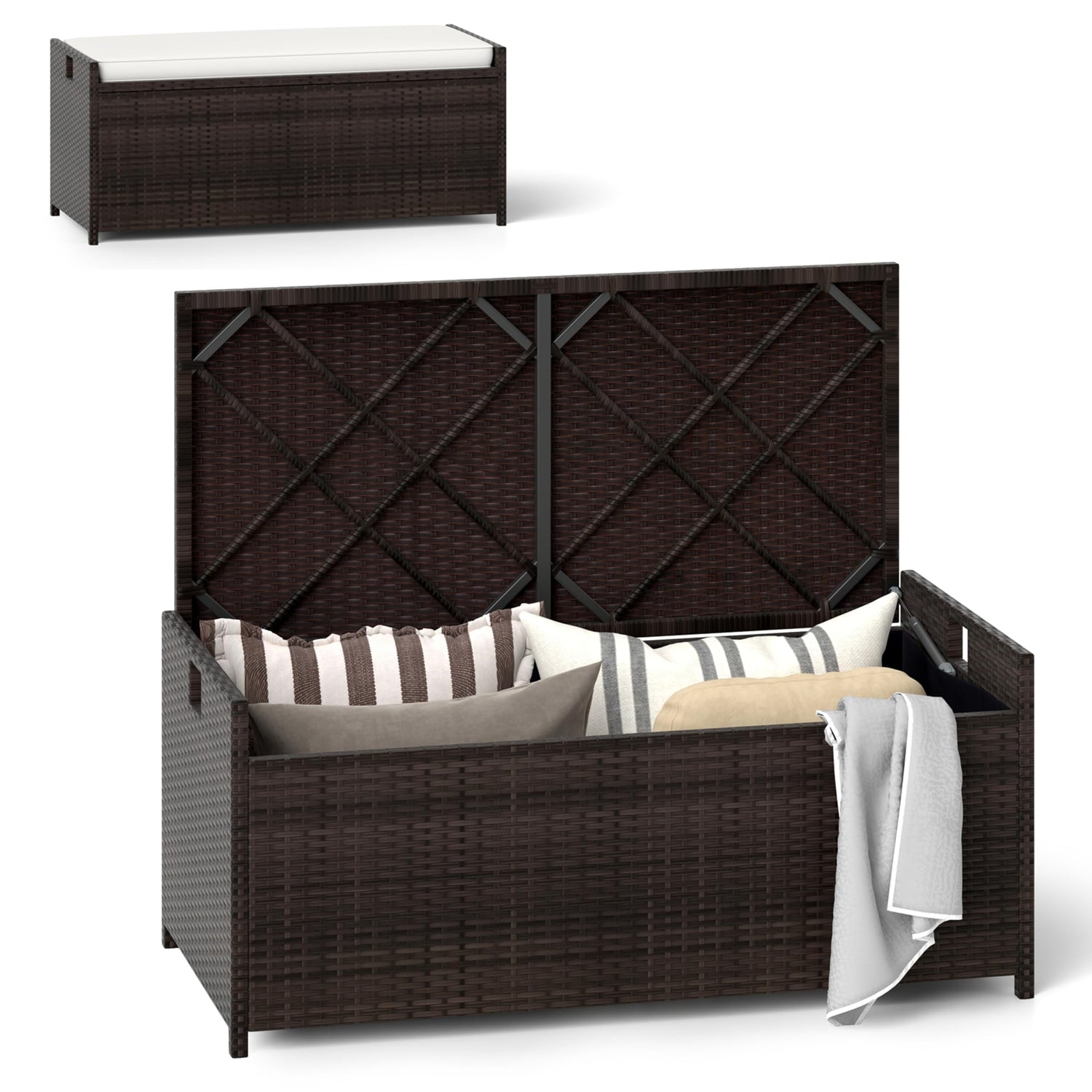 RELAX4LIFE 34-Gallon Outdoor Storage Box - Wicker Rattan Deck Box w/Seat Cushion, Waterproof Liner & Side Handles for Pillows, Patio Cushions, Pool Supplies, Garden Tools, Porch Outdoor Storage Bench