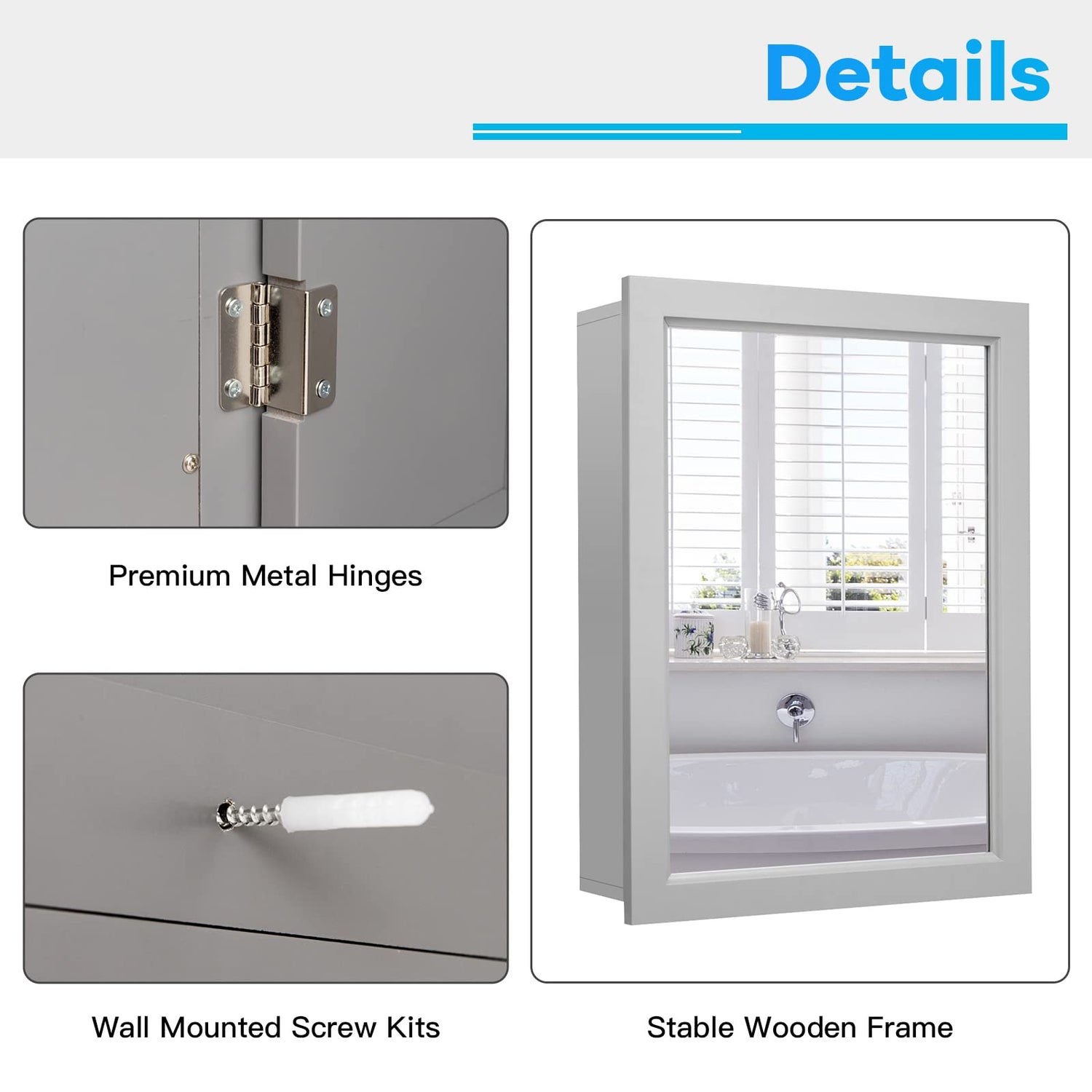 RELAX4LIFE Bathroom Medicine Cabinet with Mirror - Bathroom Wall Cabinet w/Single Door & Adjustable Shelf, Wood Mirrored Storage Cabinet Organizer, Recessed Bathroom Cabinet Wall Mount (Grey)