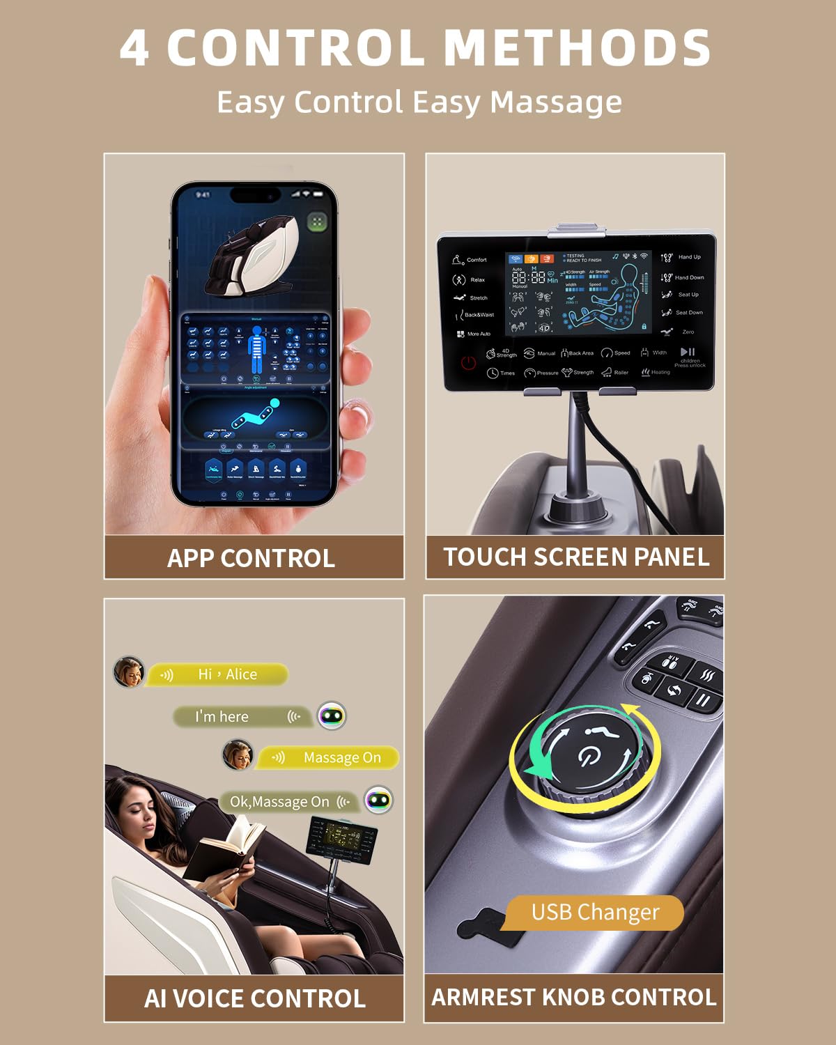 - ✔️【3 OPERATION METHODS】 Enjoy effortless control of our massage chair with three convenient operation methods. The LCD screen clearly displays all the functions, allowing for easy navigation. With AI Voice control, you can use your voice to wake up and control the chair, making it a truly hands-free experience. Additionally, the armrest shortcut keys provide quick access to frequently used functions. There is a USB charging adapter with a Type-C connector for your convenience.