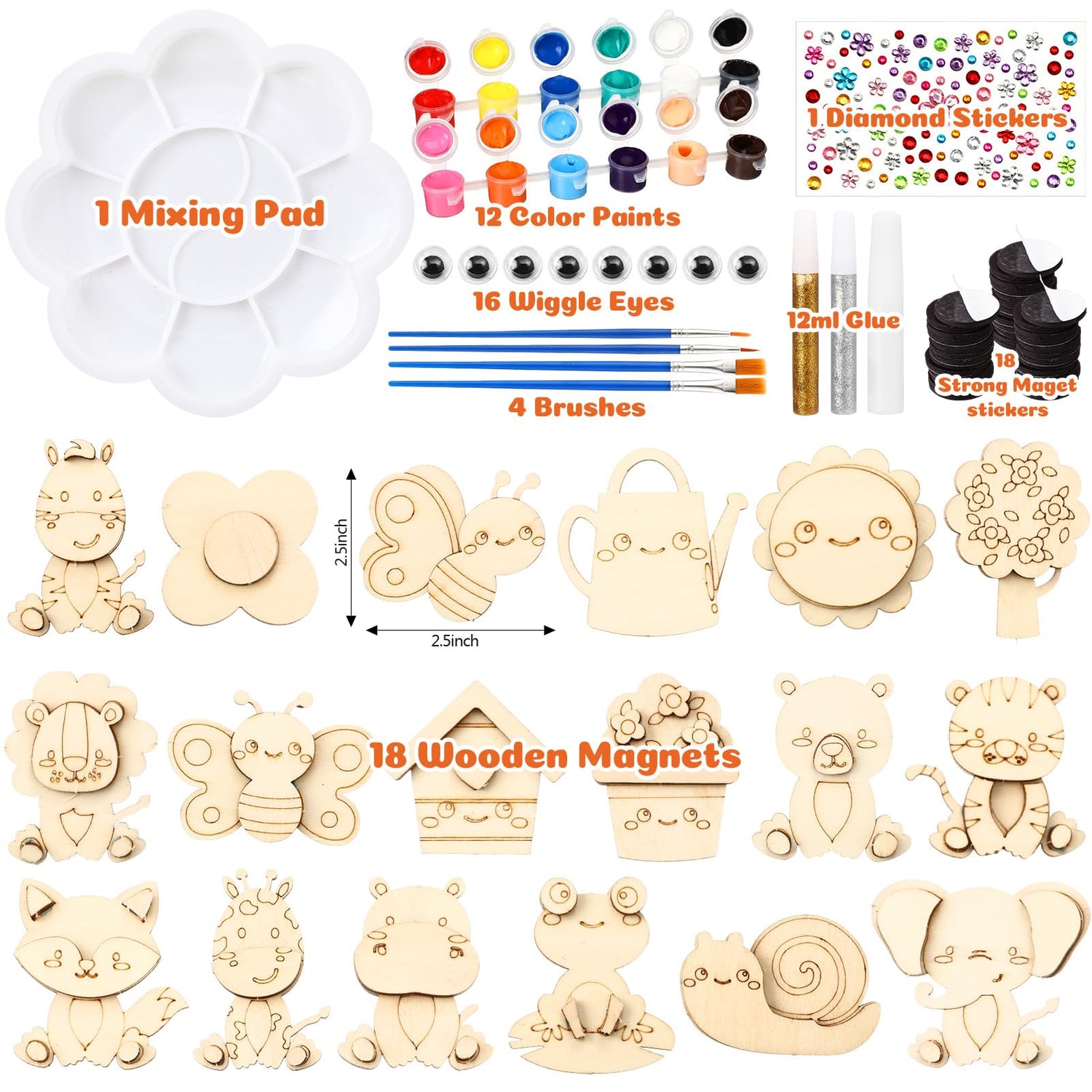 • DIY Wooden Magnet Painting Kit: our painting craft activities kit includes 18 wooden crafts, 18 magnet stickers, 16 googly eyes, 4 brushes, 2 glitter glue (gold and silver), 1 paint palette, 2 sets of color paints (totaling 12 colors), 1 sheet of diamond stickers and 2 glue; Escape into your creative world with our wooden painting crafts