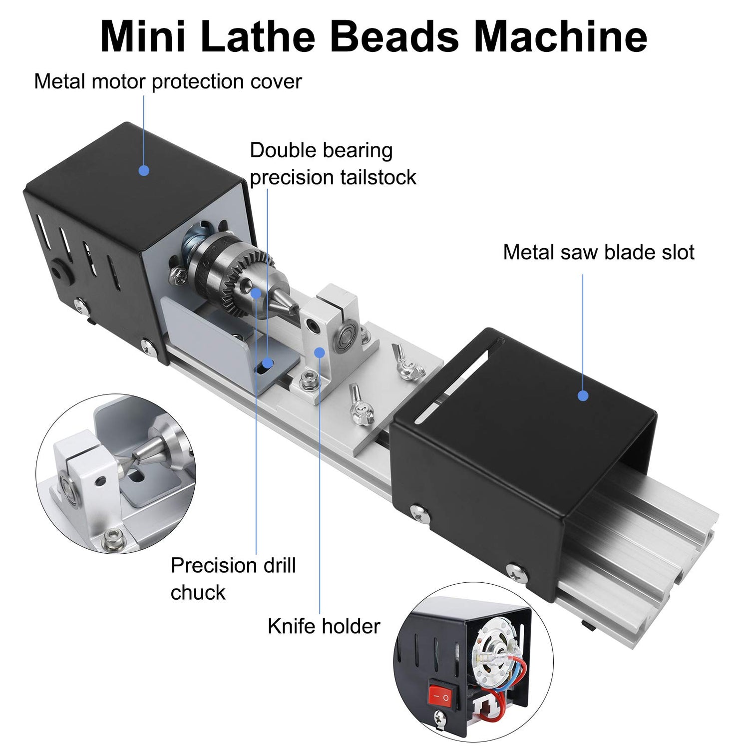 Details: Features : High power ball bearing motor and high rotating speed Adjustable rotating speed, 7 levels Made of high quality aluminum alloy and pure steel Easy and safe to operate Specifications : Power: AC 110V-240V - 5060Hz 100W Rotating Speed Range: 5000-10000 RPM Max. Processing Length: 5.5 Inch Max. Processing Width: 2 Inch Max. Processing Thickness: 2 Inch Product Size: 12.3x2.5x2.6 Inch Package Including : 1pcs Mini Lathe Beads Machine 1pcs AC Power Adapter and other many accessories meeting on the picture