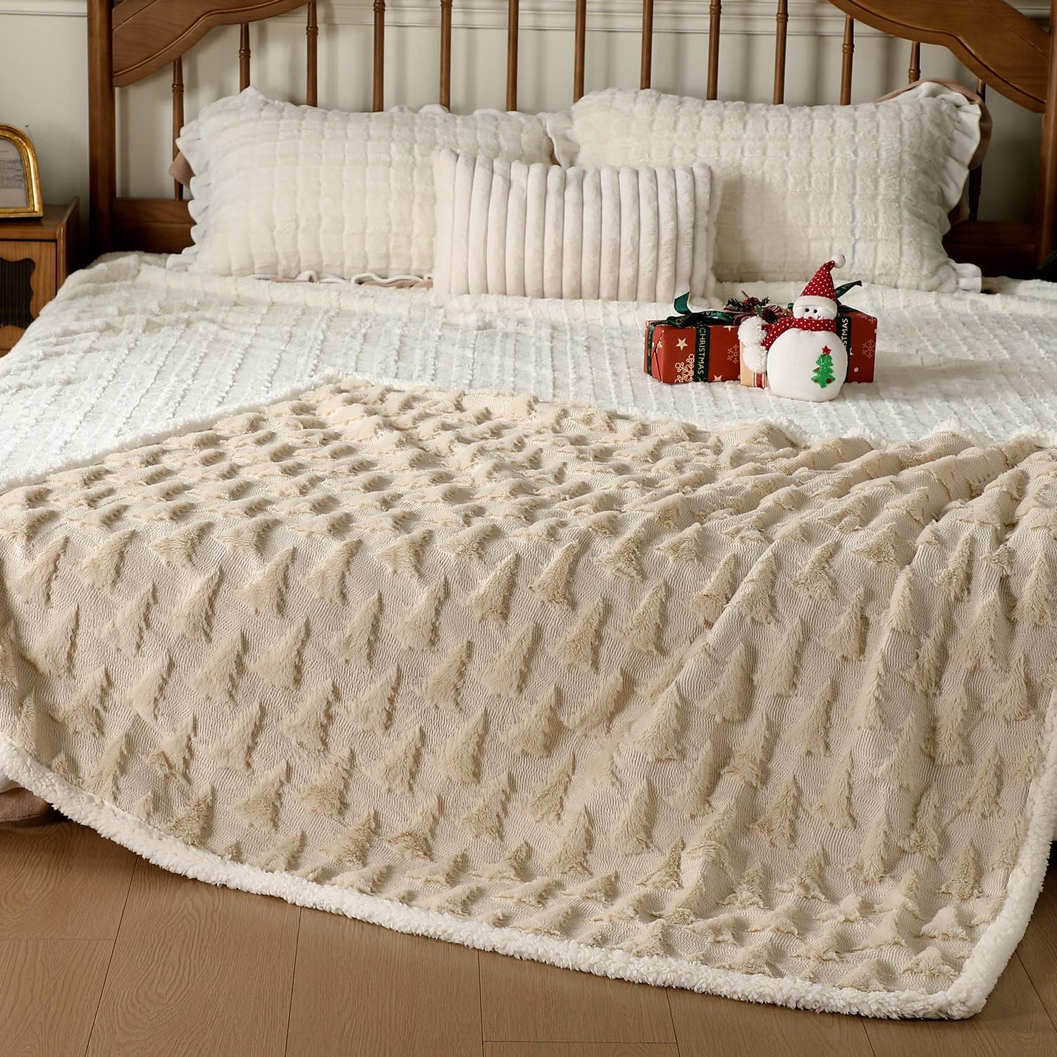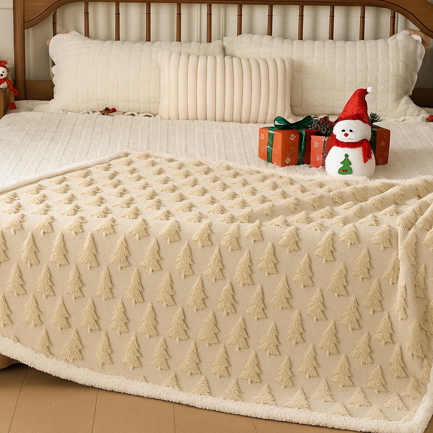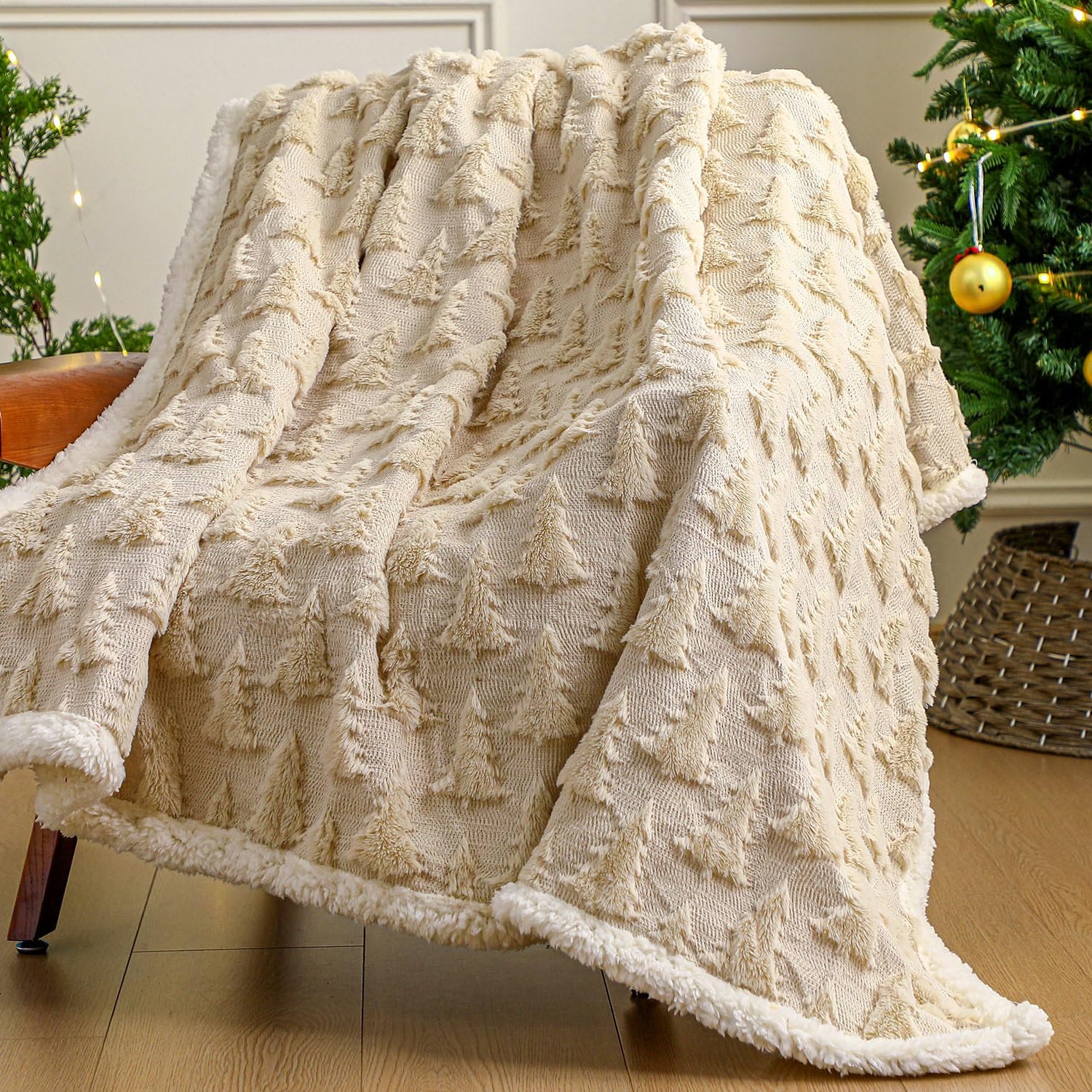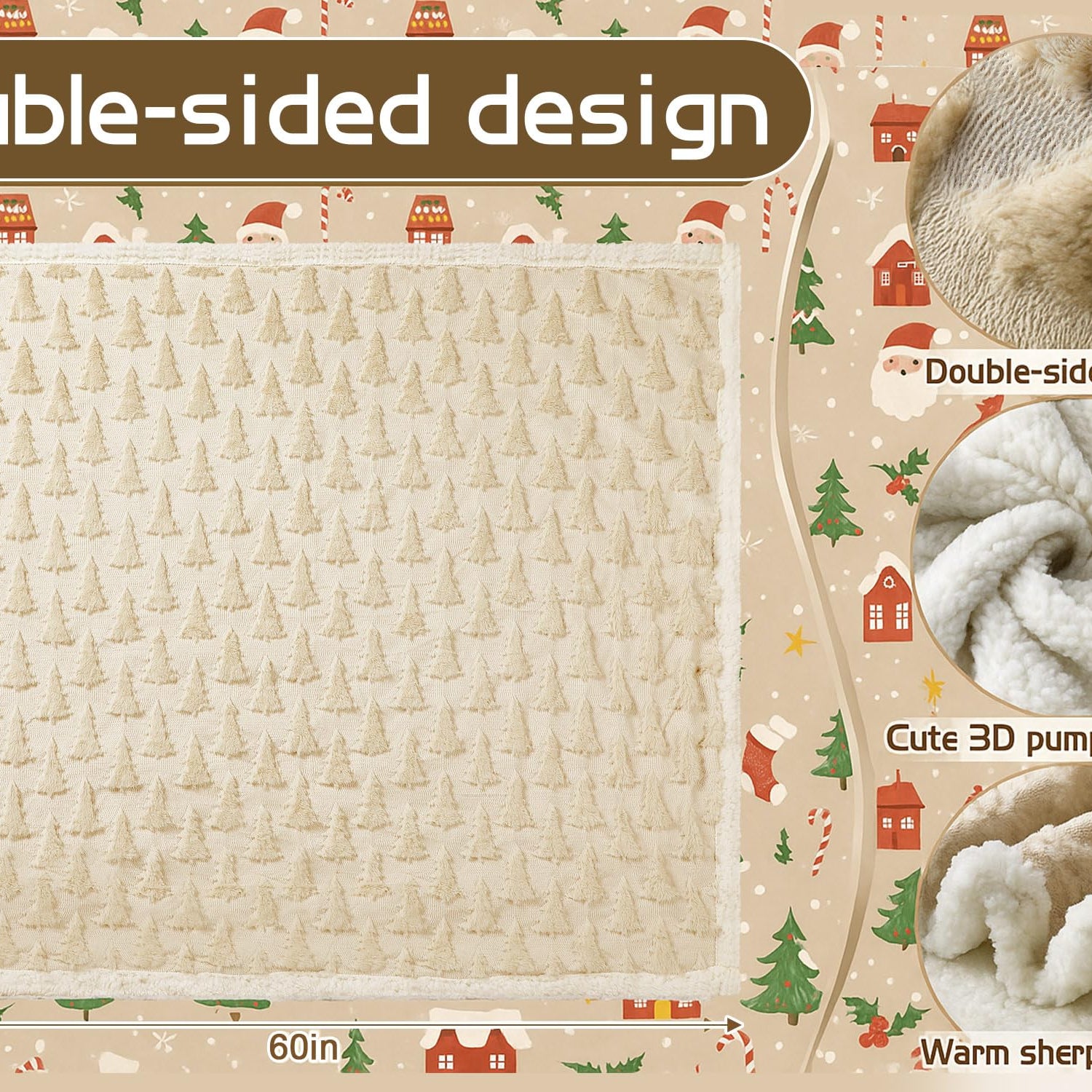 - Festive Christmas Design: adorn your space with holiday cheer; This throw blanket showcases a charming 3D Christmas tree pattern on a beige background on one side, complemented by a clean white on the other, ideal for embracing the festive spirit