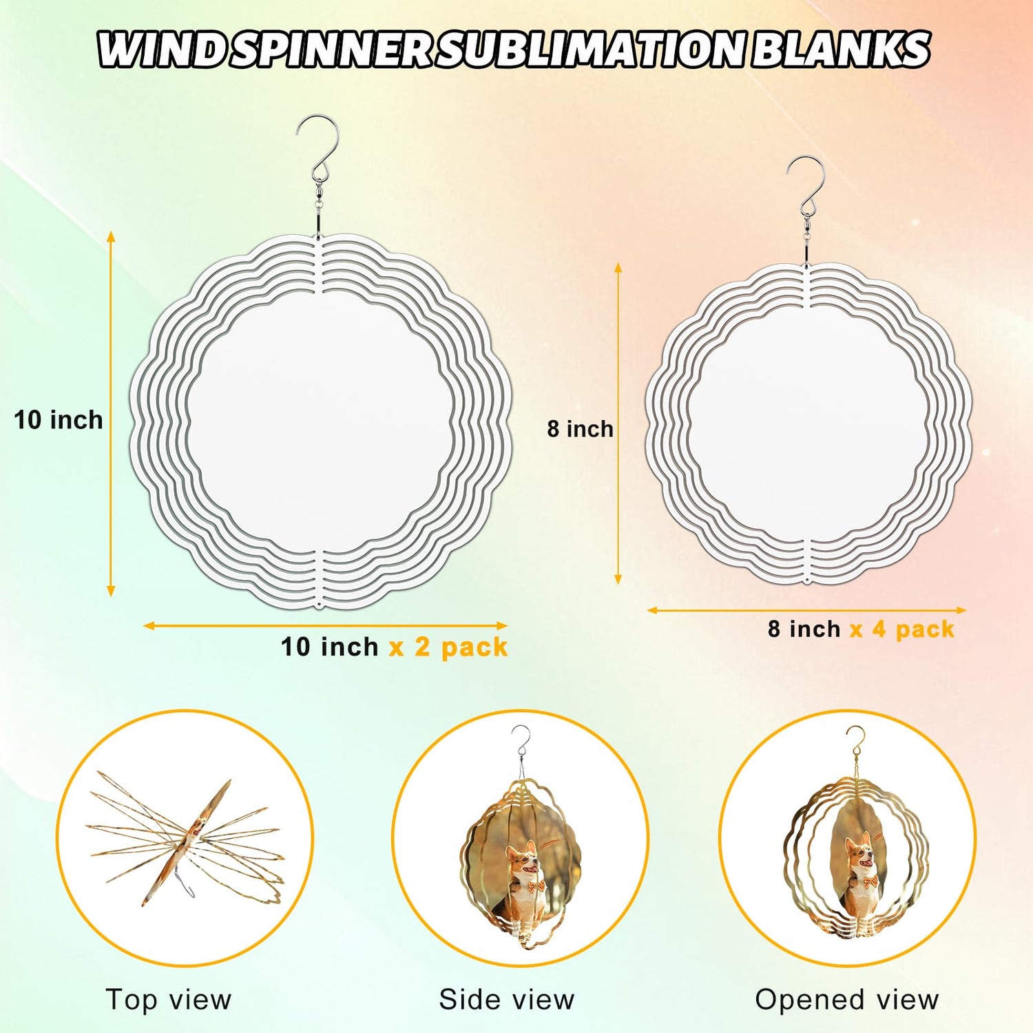 - [WHAT YOU'LL GET] You will receive 6 packs of 10-inch sublimation wind spinner blanks and 6 rotating hooks for hanging, all neatly packaged in a beautiful box. This ample quantity and suitable size cater to your customization and replacement needs, allowing you to unleash your creativity and transform it into charming home and garden decorations. If you have any questions about our sublimation wind spinner blanks, please let us know