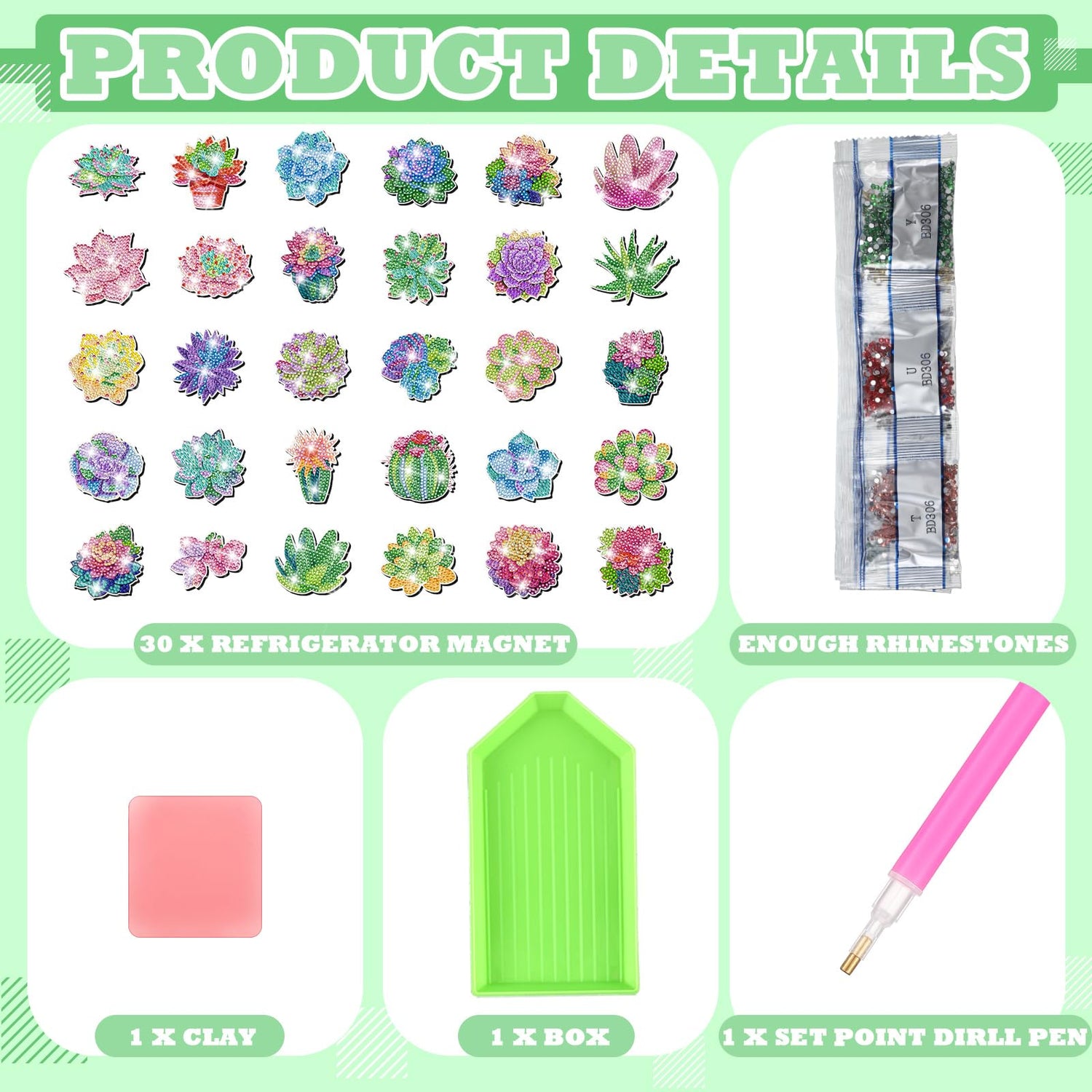 Remuuly 30 Pcs Diamond Painting Magnets Summer Diamond Art Magnet Kits for Adults Spring Flower Animal Cupcake 5D Rhinestones Refrigerator Magnetic Stickers for Fridge DIY Crafts Gifts(Succulents)