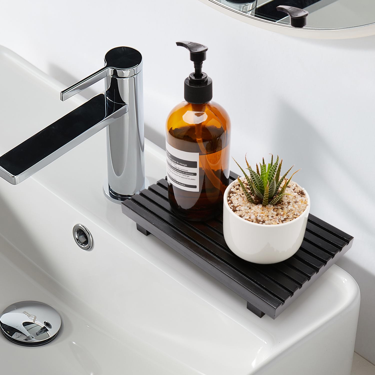 Details: Small Bathroom Counter Organizer Tray Decorative Wood Pedestal Stand for Kitchen Counter Decor Wooden Risers for Bathroom Sink Accessories Kitchen Soap Tray Vanity Black Bathroom Decor Dish Soap Holder