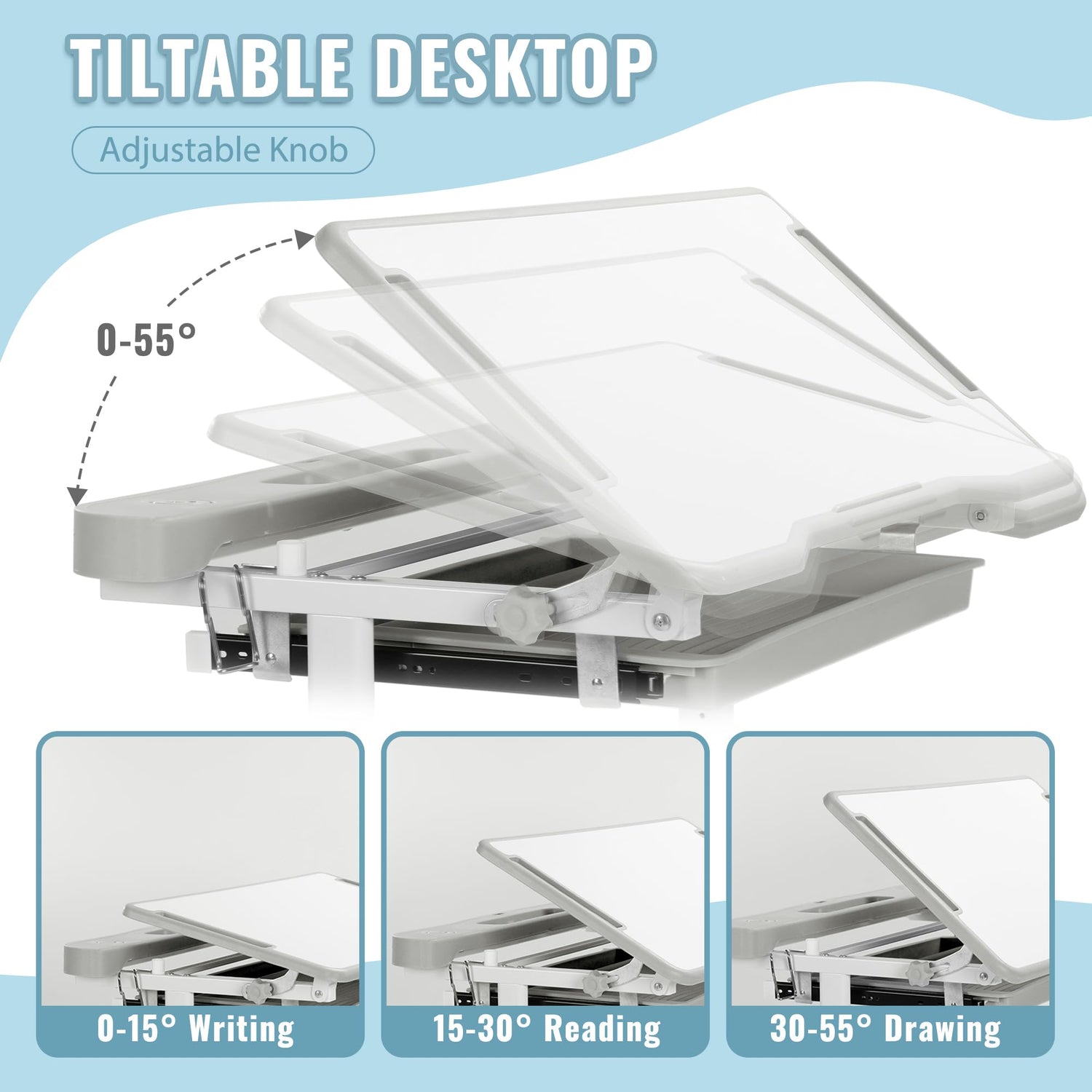 - Tiltable Desktop: Our student desk features a large adjustable angle tilting desktop that can be infinitely adjusted from 0-55° to find the perfect angle for writing, reading, or drawing; The adjustable angle reading stand allows children to free their hands while learning
