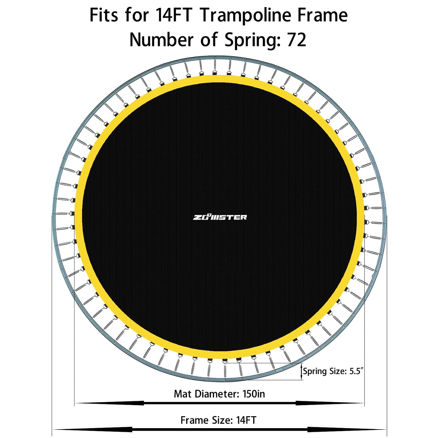 - Fits 14 ft round trampoline with 72 v-rings, using 5.5 inches springs; Mat width: 150 inches; Note: frame & springs not included.
