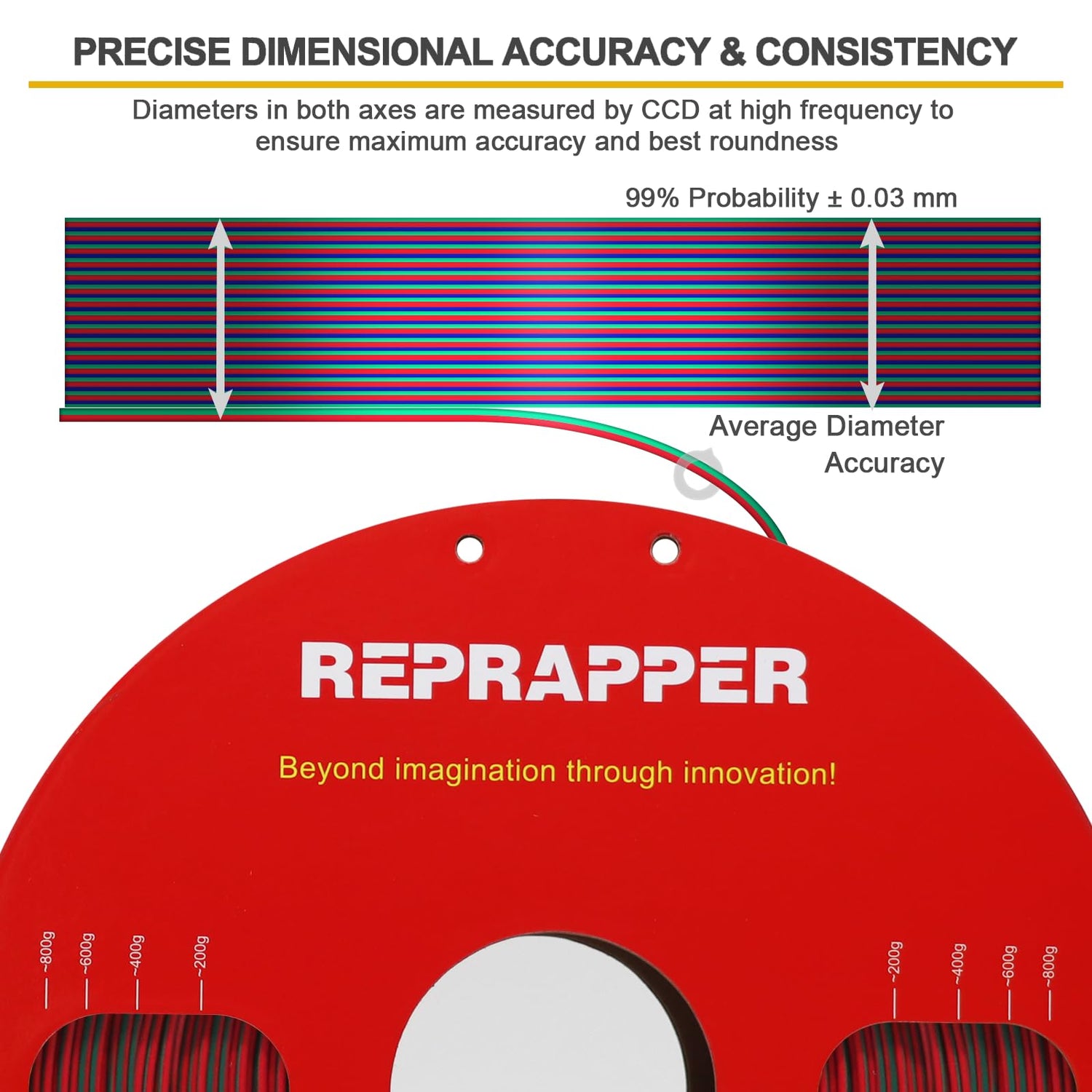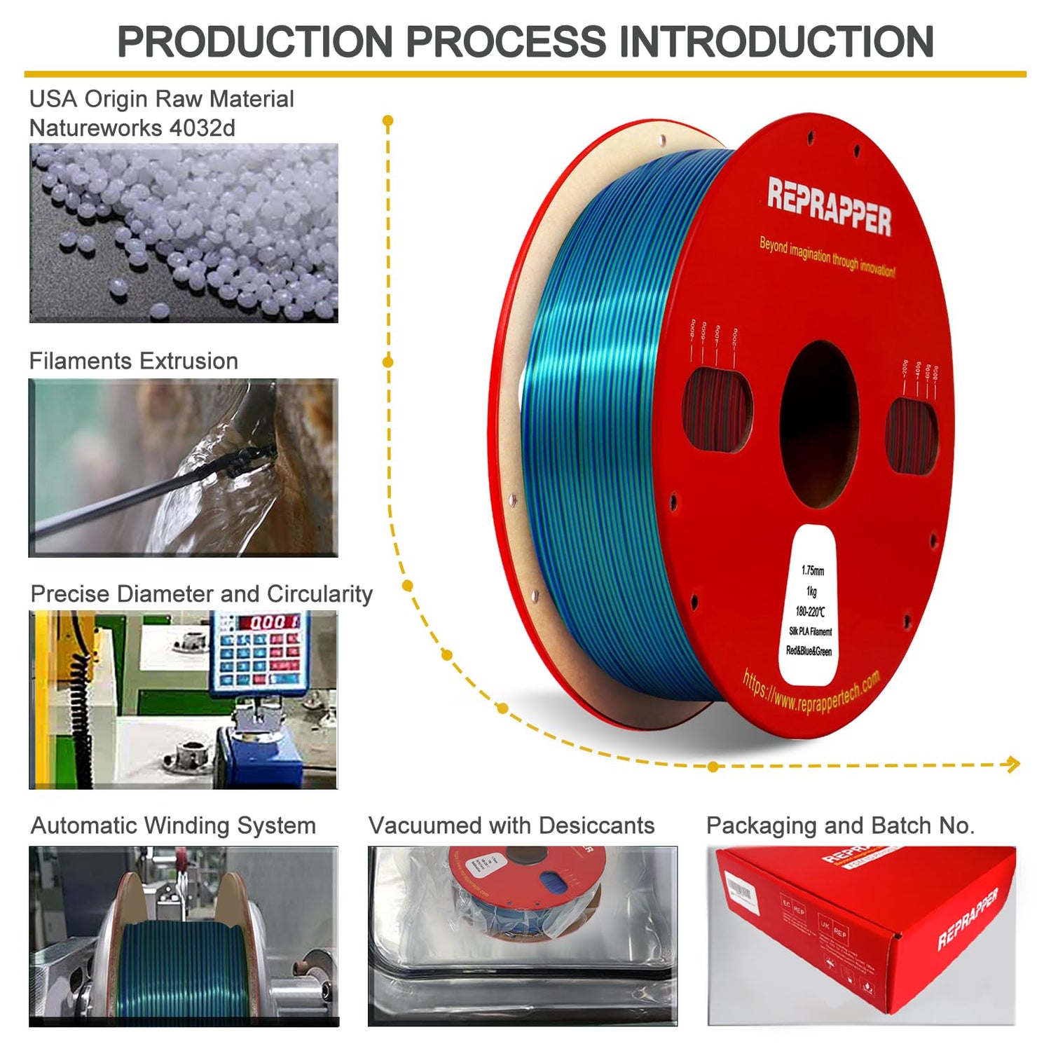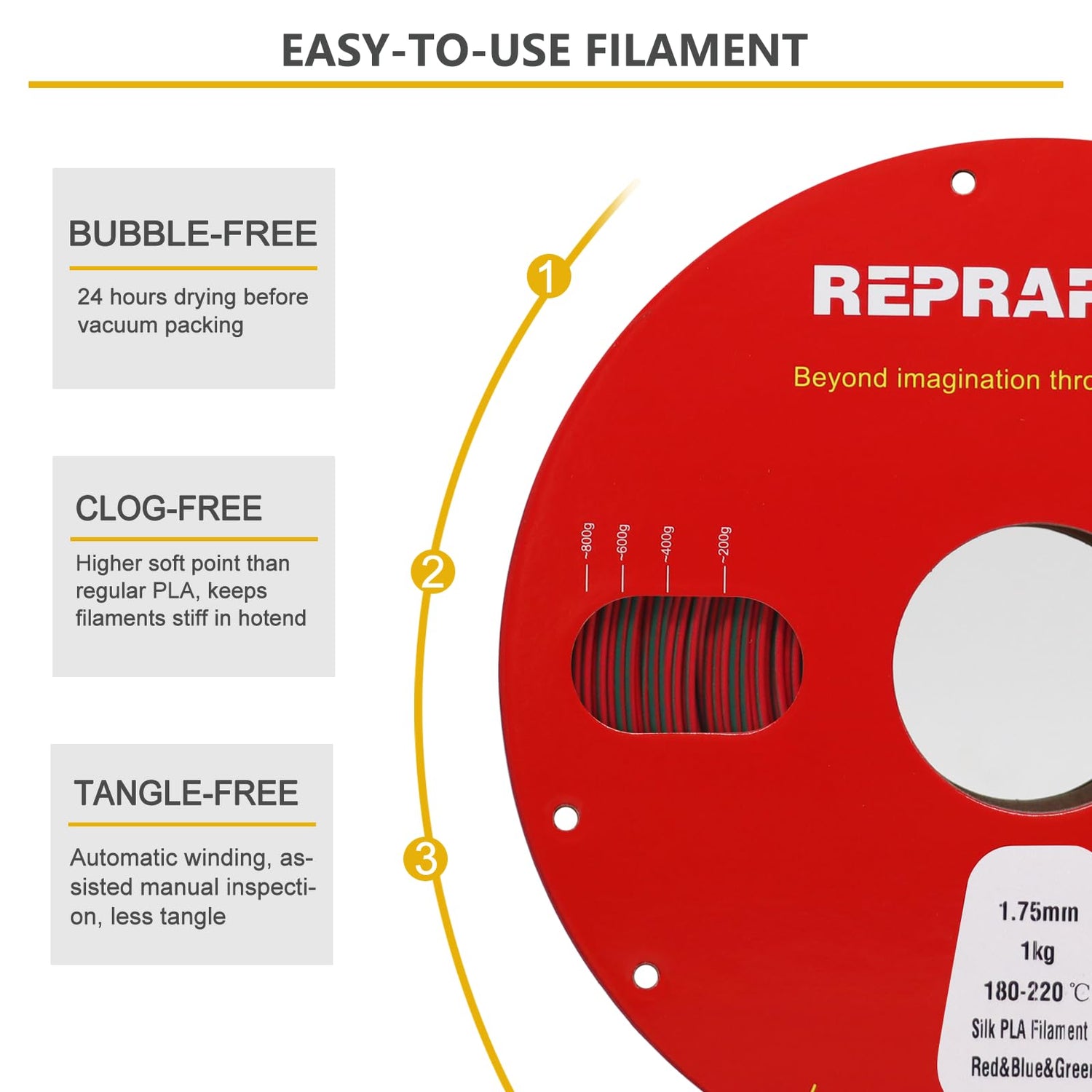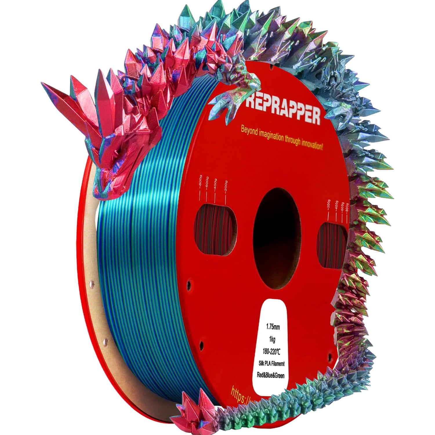 Reprapper Triple Color Filament Coextrusion PLA Filament 1.75mm for 3D Printer, Multicolor Like Dual Color Rainbow PLA, 2.2lbs (1kg), Silk PLA Red/Blue/Green