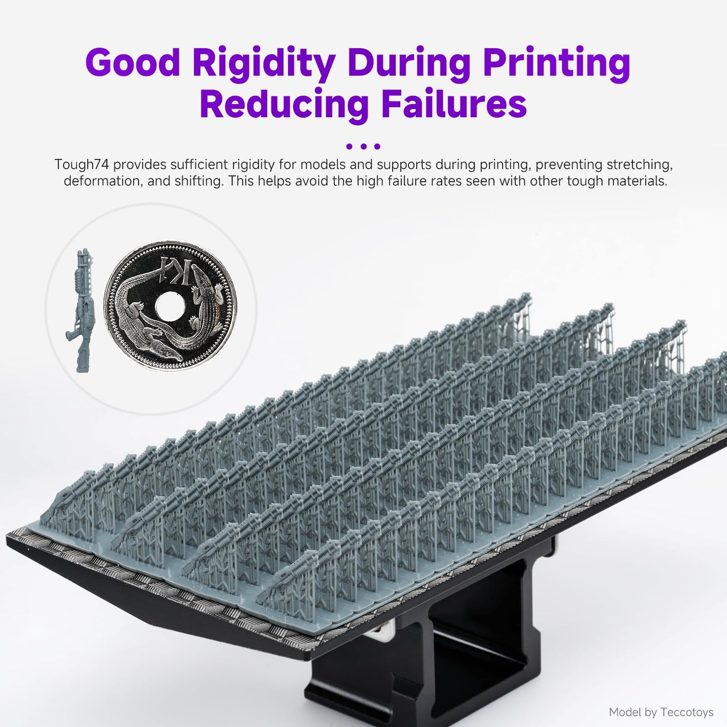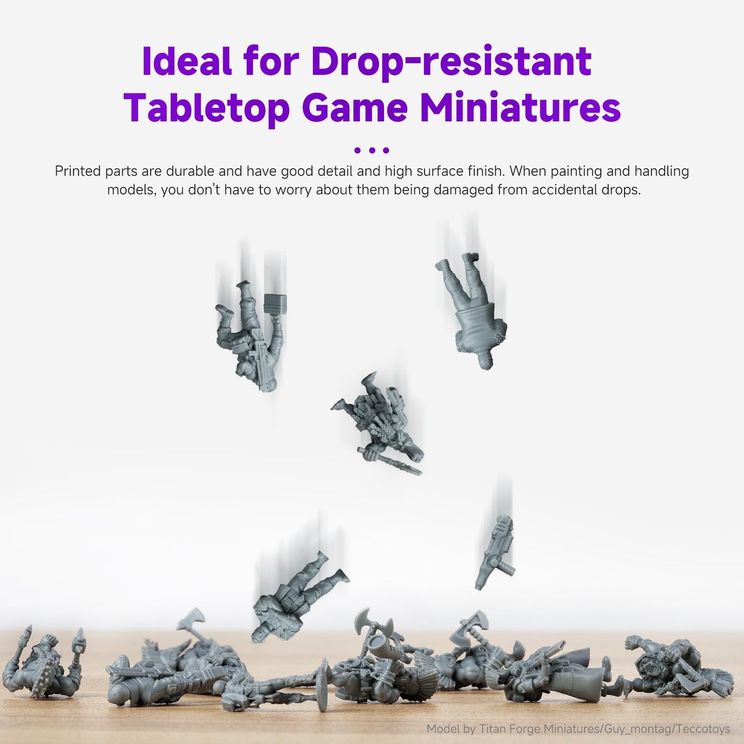 - Ideal for Drop-resistant Tabletop Game Miniatures: Its durability, good detail, and high surface finish make Tough74 an ideal material for 3D printing tabletop game miniatures. When painting and handling models, you don't have to worry about them being damaged from accidental drops, greatly enhancing the gaming experience. However, we recommend using a layer height of 0.05mm instead of 0.02-0.03mm for miniatures to avoid significantly increased printing difficulty