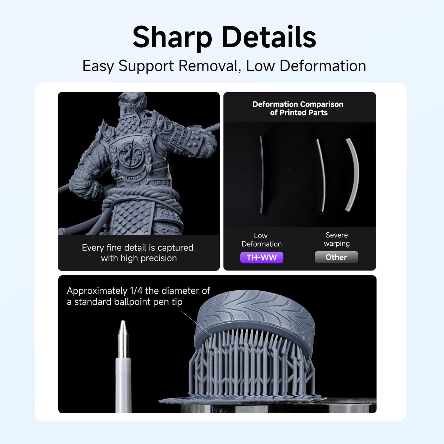 - 【Fine Details, Wear-Resistant, and Anti-Yellowing】 TH-WW delivers exceptional detail accuracy. The carefully designed mechanical properties make support removal easy, and lightweight models support ultra-fine 0.15mm support points. The non-transparent color series of printed parts won't easily generate powder during friction, while the transparent color series is resistant to yellowing. This makes it ideal for printing finely detailed miniatures, GK, transparent anime effect parts, and other models that require high color stability.