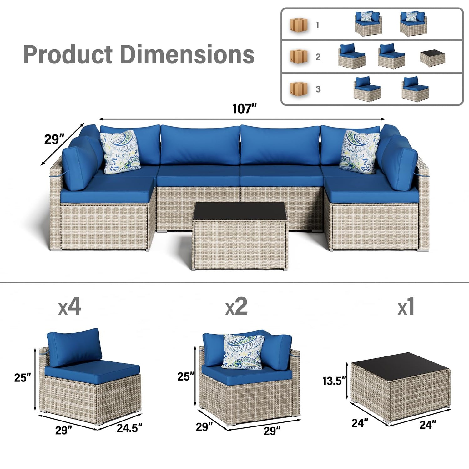 RESOM 7-Piece Gray Rattan Patio Furniture Sets, Outdoor Conversation Sofa Sets with Water Resistant Blue Cushions & Tempered Glass Coffee Table, Modular Outdoor Sectional Sofa Sets with 2 Pillows