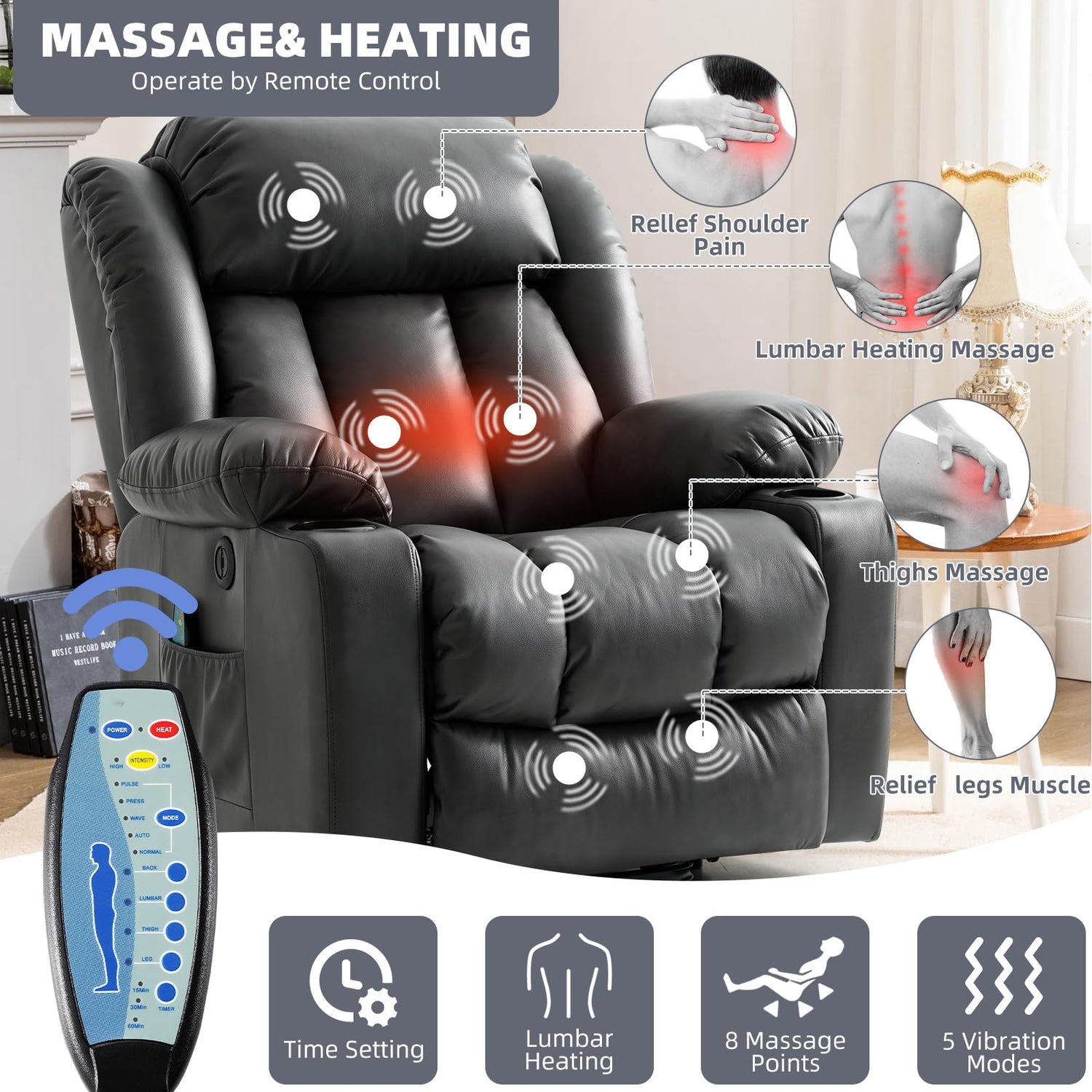 - [Relaxing and Soothing] Use this incredible lounge chair to relax and soothe your body. Equipped with 5 adjustable massage modes (normal, automatic, wave, press, pulse), 8 vibration nodes (back, waist, thigh, and leg), and 3 intensity options (high, medium, low). The integrated lumbar heating system can dissipate heat during massage, promote lumbar decompression, blood circulation, and relieve fatigue.