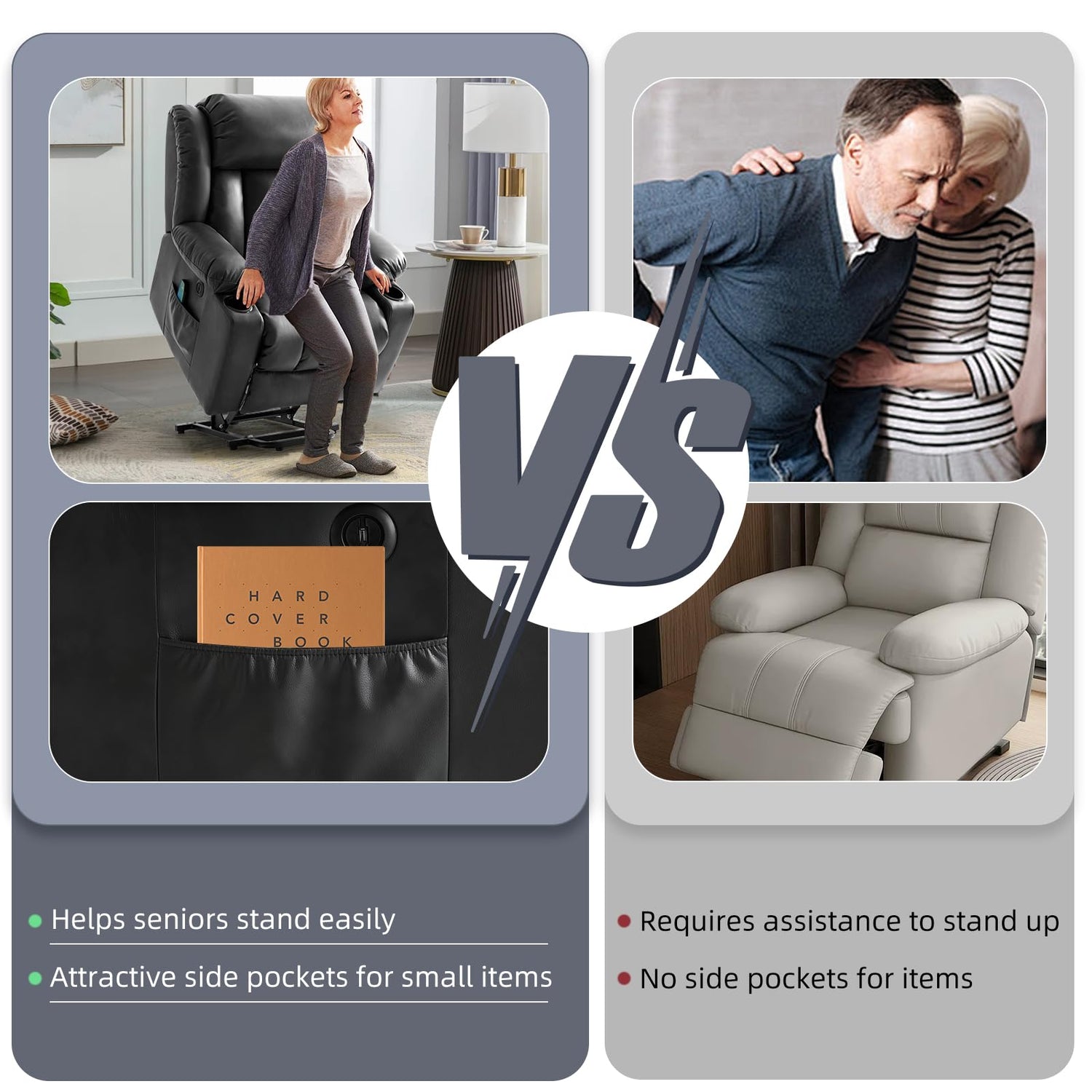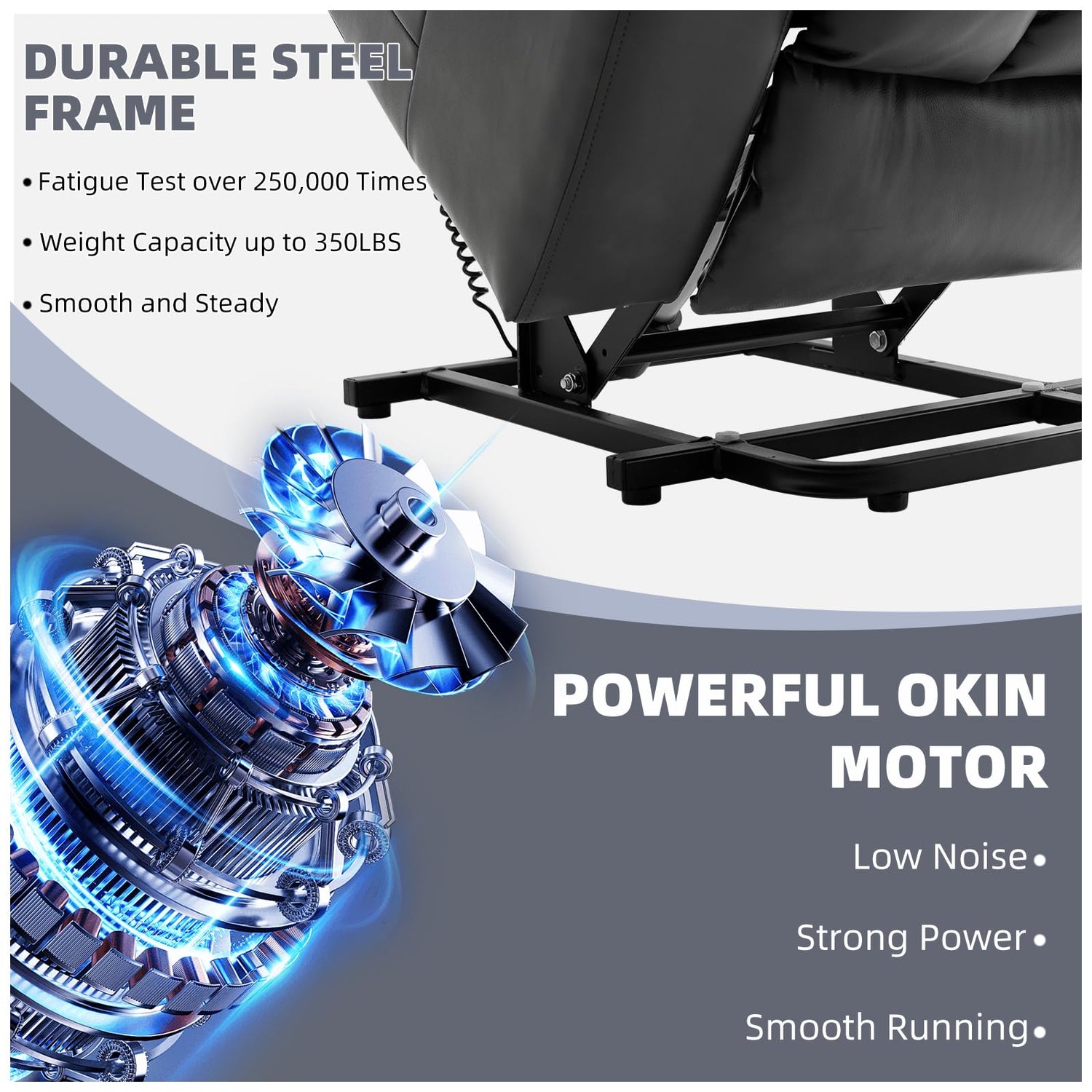 - [Electric lifting and standing assistance]Our balance lifting mechanism is driven by a powerful German OKIN motor, providing seamless standing assistance. Smoothly enhancing the overall stability of the chair, allowing users to effortlessly ascend without putting pressure on their back or knees. This feature is particularly beneficial for elderly people, pregnant women, or those who have difficulty standing from a sitting position