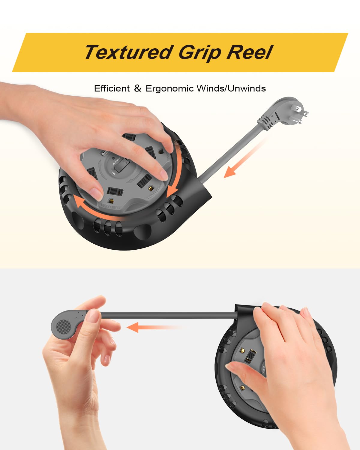 - Easily Wind and Unwind:Comes with extension cord winder, this electrical cord reel allows effortless winding and unwinding of the wire; Rotating surface yellow round disc clockwise is supports to wind the power cord easily into electric cord reel and keep the cords neat and tidy for next use