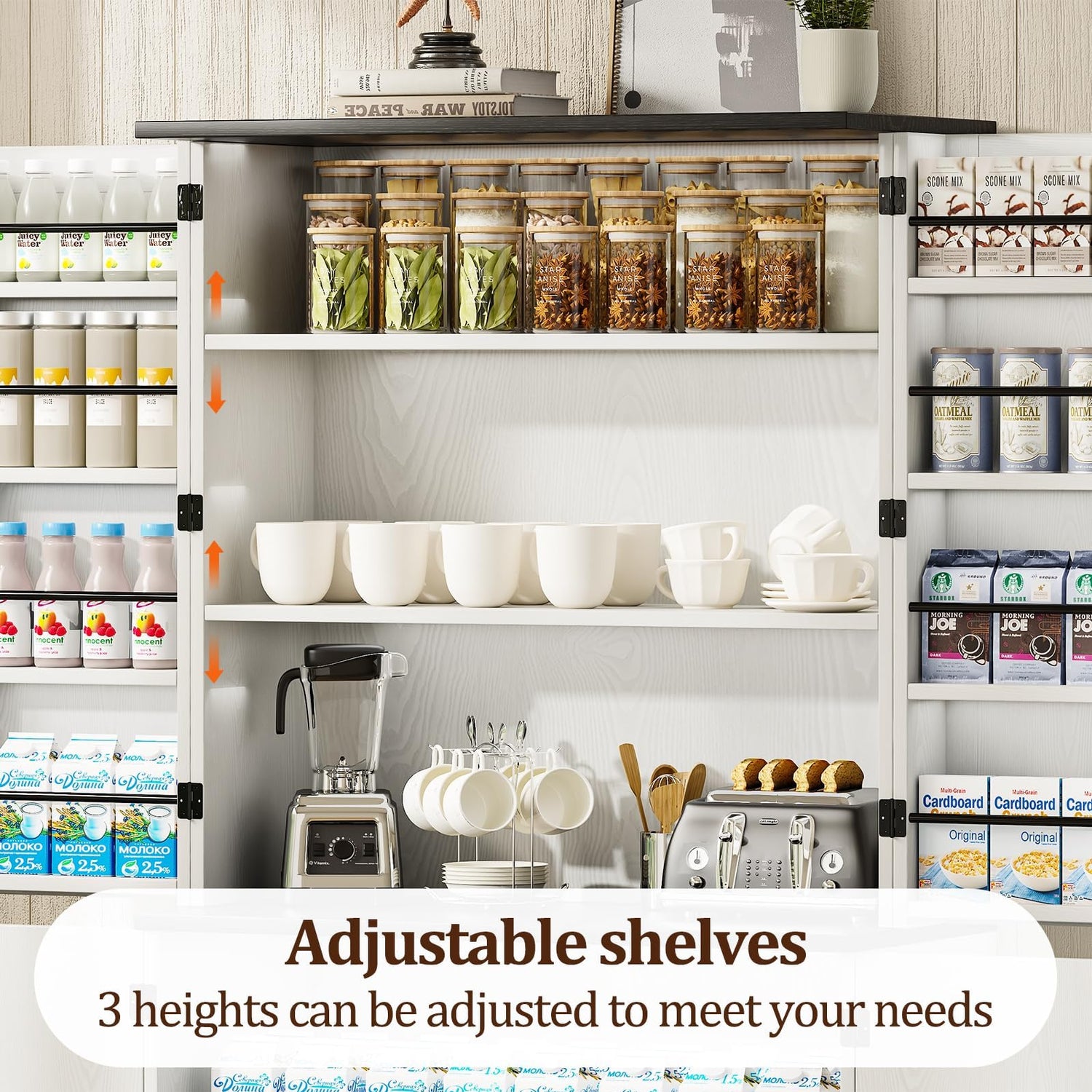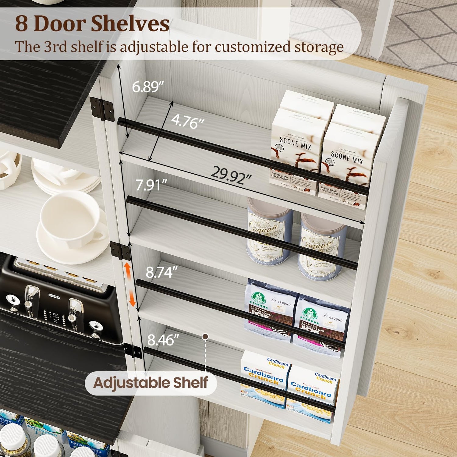 - Farmhouse Kitchen Pantry Storage Cabinet: The kitchen pantry cabinet Includes 8 door storage racks that can be tailored to maximize additional storage space for easily accessing small kitchen essentials like spices, this design also helps to categorize and organize items efficiently, keeping frequently used products at eye level and easily reachable