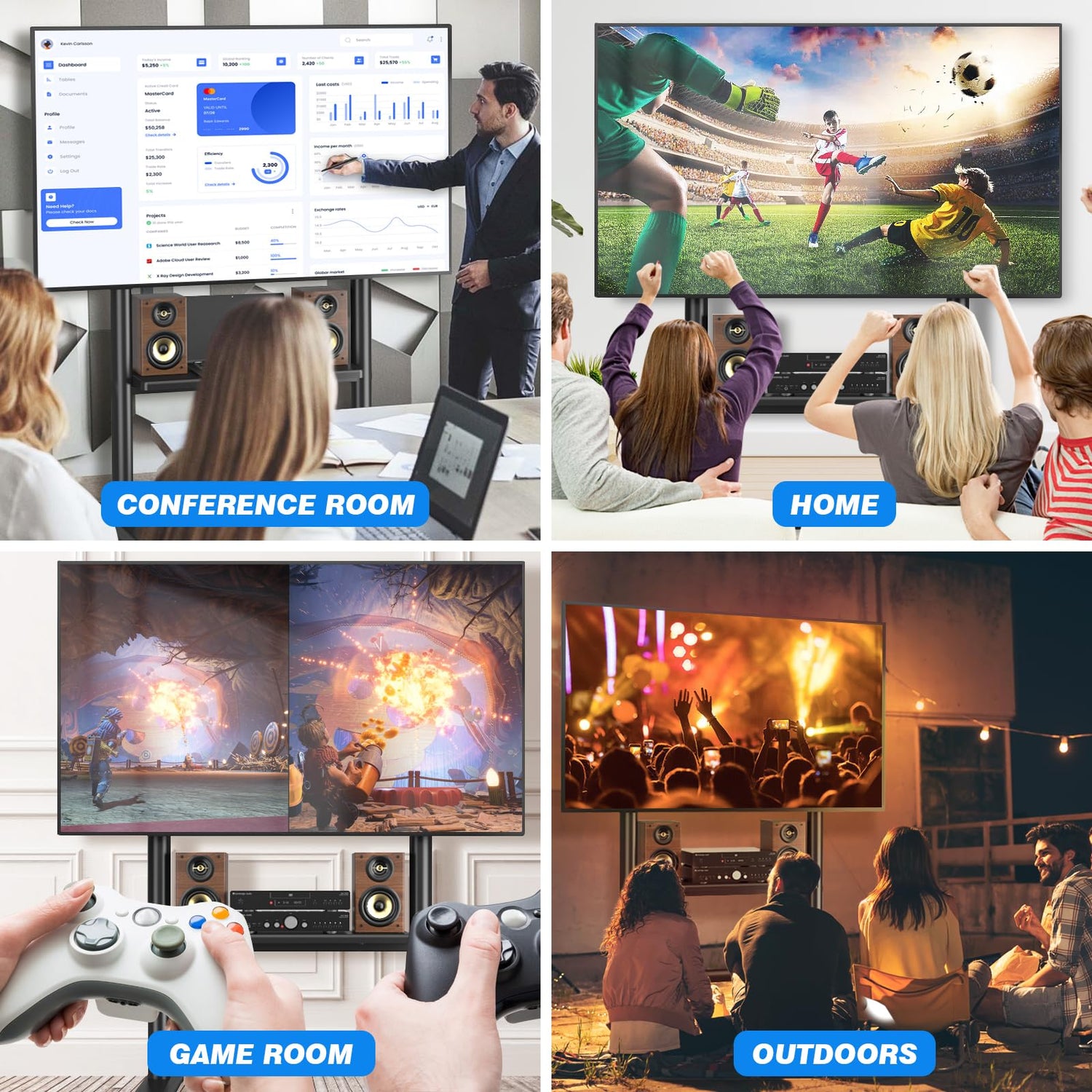 - HEIGHT ADJUSTABLE & CABLE MANGEMENT - CREATE AN OPTIMAL VISUAL FEAST: Our outdoor rolling TV cart provide height adjustable from 63.5"-70.6" from the floor to the center of the screen, which can meet most of your viewing needs; Let you determine the best viewing angles can't be easier; In addition, integrated cable mangement collects the messy cables and allows you to have a clean environment