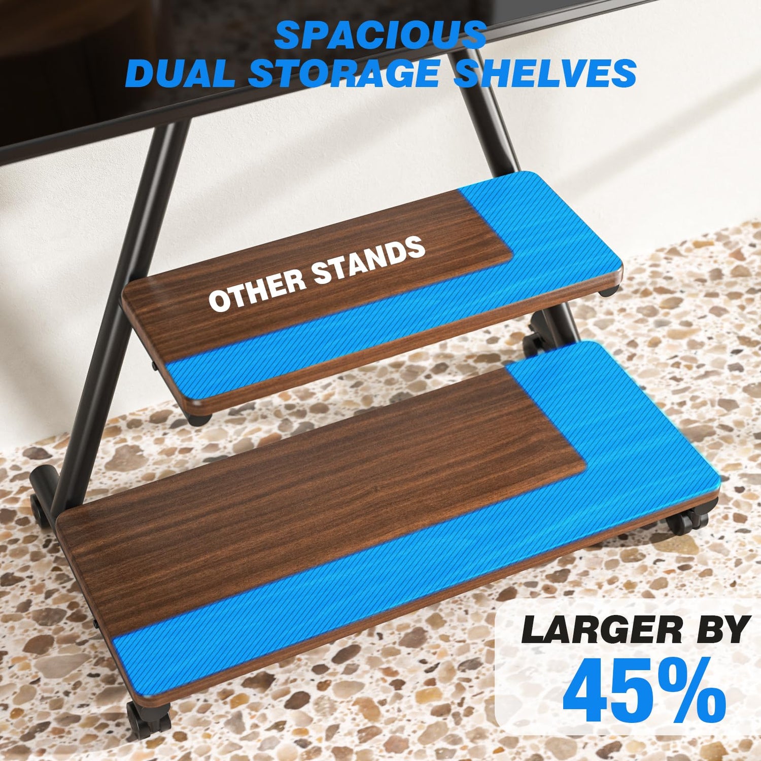- SPACIOUS DUAL STORAGE SHELVES: Our rolling TV cart features two wooden storage shelves, perfect for storing a variety of components such as DVR, PC, PS5, ensuring it meets all your daily storage needs; Compared to other products, our shelves are 45% larger and 20% stronger, the upper shelf can hold up to 66 lbs and the lower shelf can hold up to 77 lbs; Whether you need a home entertainment center or an organized office space, our product offers superior storage solutions