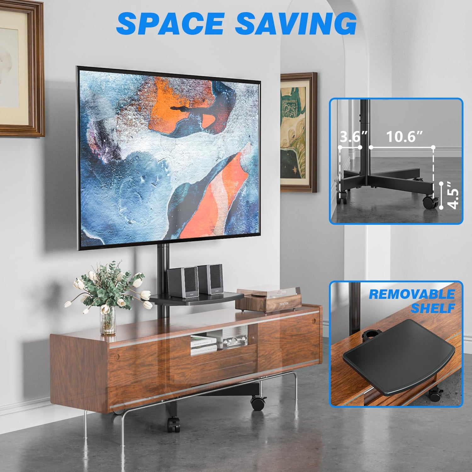 - PORTABLE UNIVERSAL STAND: TV cart with wheels fits most 23" to 60" Lcd Led Oled Plasma smart fire flat screens, curved tvs, computer monitors or weatherproof outdoor televisions, tv mount with max VESA (mounting hole pattern) 400x400mm (16"X16"). A real space saver floor tv stand can be placed close to the wall, is also convenient for moving your TV around in the bedroom, living room, dorm room, home or office.