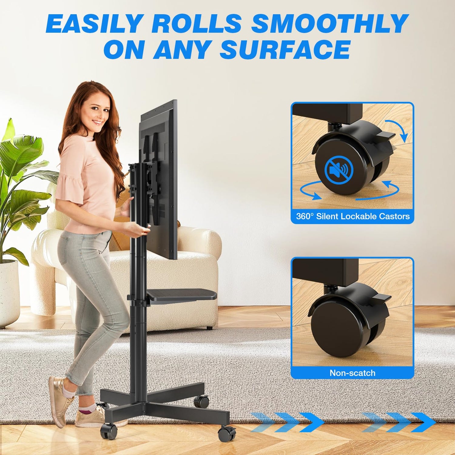 - UPGRADED 360° ROTAING LOCKABLE WHEELS: Say goodbye to static TV! Our rolling TV stand includes 4 pieces of upgraded 360° rotating wheels; When you are on the move, you can wrap the power cord around the outlet and never have to hold it in your hand and push the TV stand hard; The wheels provide a smooth glide on both hardwood and carpet floors; Whether you're working in your home office, cooking in the kitchen, practicing yoga, or just relaxing in the living room, our TV cart is a perfect fit
