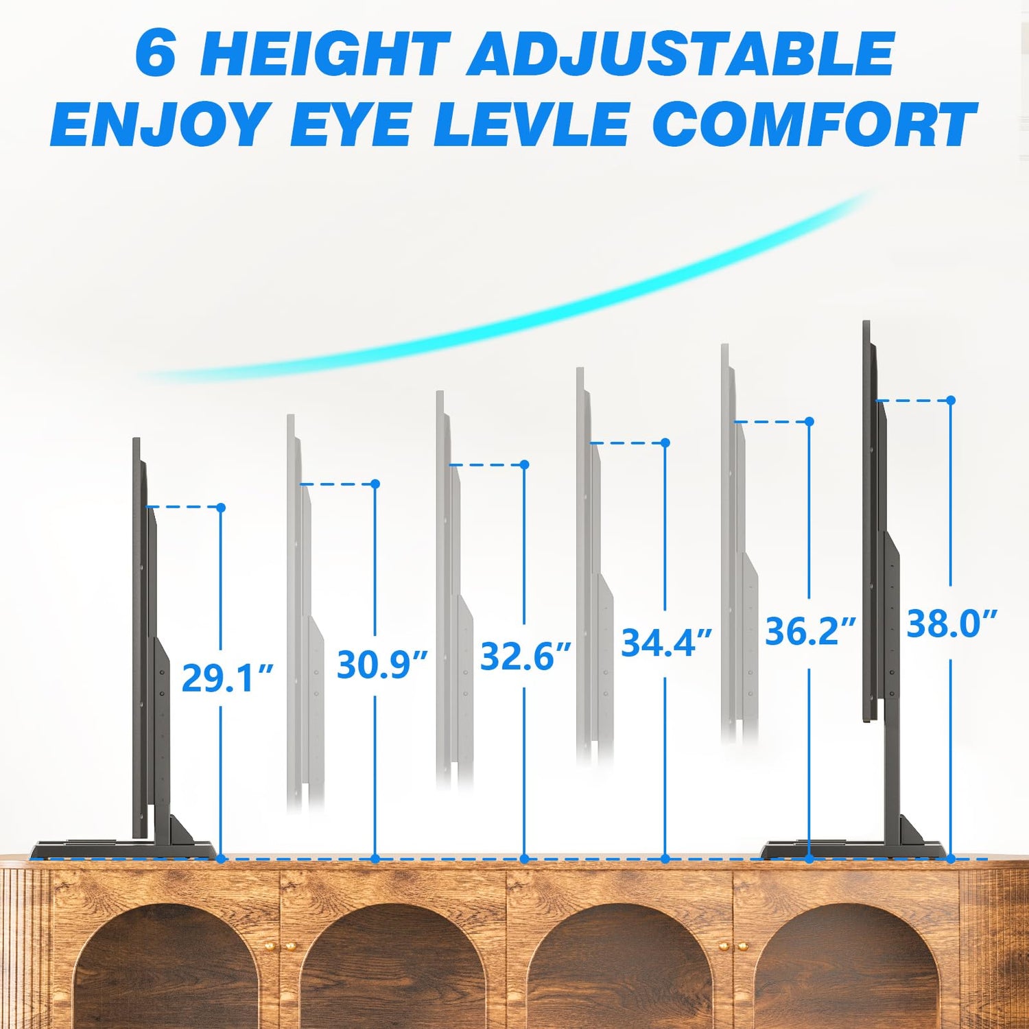 - HEIGHT ADJUSTMENT - MEET YOUR VARIOUS HEIGHT NEEDS: Our table top TV stand is designed with 6 levels of height adjustment, 1.8" per level, and the total height can be adjusted up to 8.9"; Meet your different height needs and adjust the perfect viewing angle; You can also place speakers on the feet of the stand; we have specially designed a shock-absorbing anti-slip sticker for speakers, which can effectively reduce the vibration of the speakers, bringing a better audio-visual experience