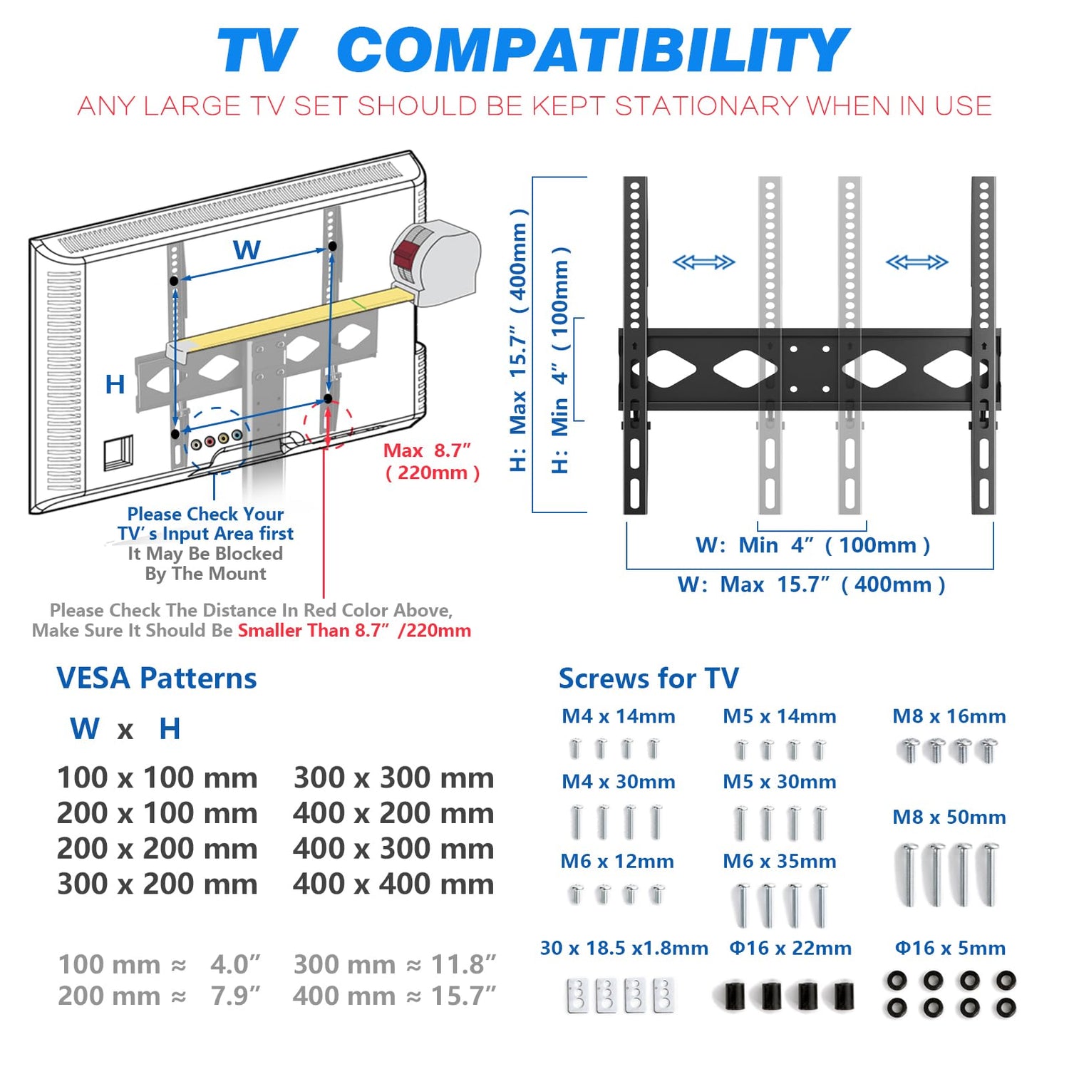 - TV VESA: Before purchase this stand please make sure this TV stand mount will fit your TV, please insure your TV's VESA bolt pattern falls between these two sizes : 100(w)mm x 100(h)mm (4"x4") up to 400(w)mm x 400(h)mm (16"x16"), please turn to the image named "TV compatibility" for more details