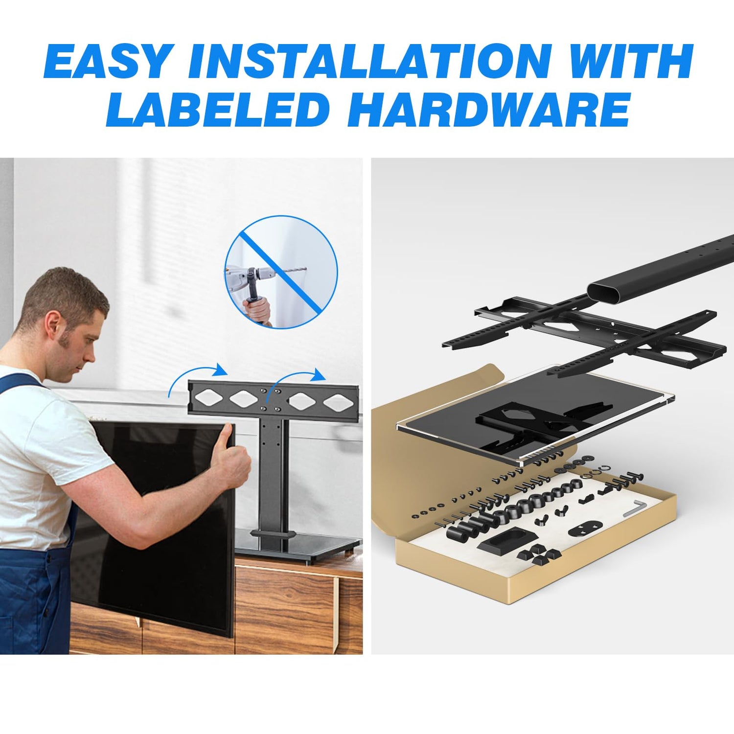 - EASY INSTALLATION: The universal TV stand base comes with an easy-to-follow instruction manual for quick and easy installation. All relative fittings are provided, saving a trip to the building supply store. Best of all, the tabletop TV stand requires no drilling and doesn't need to damage your wall