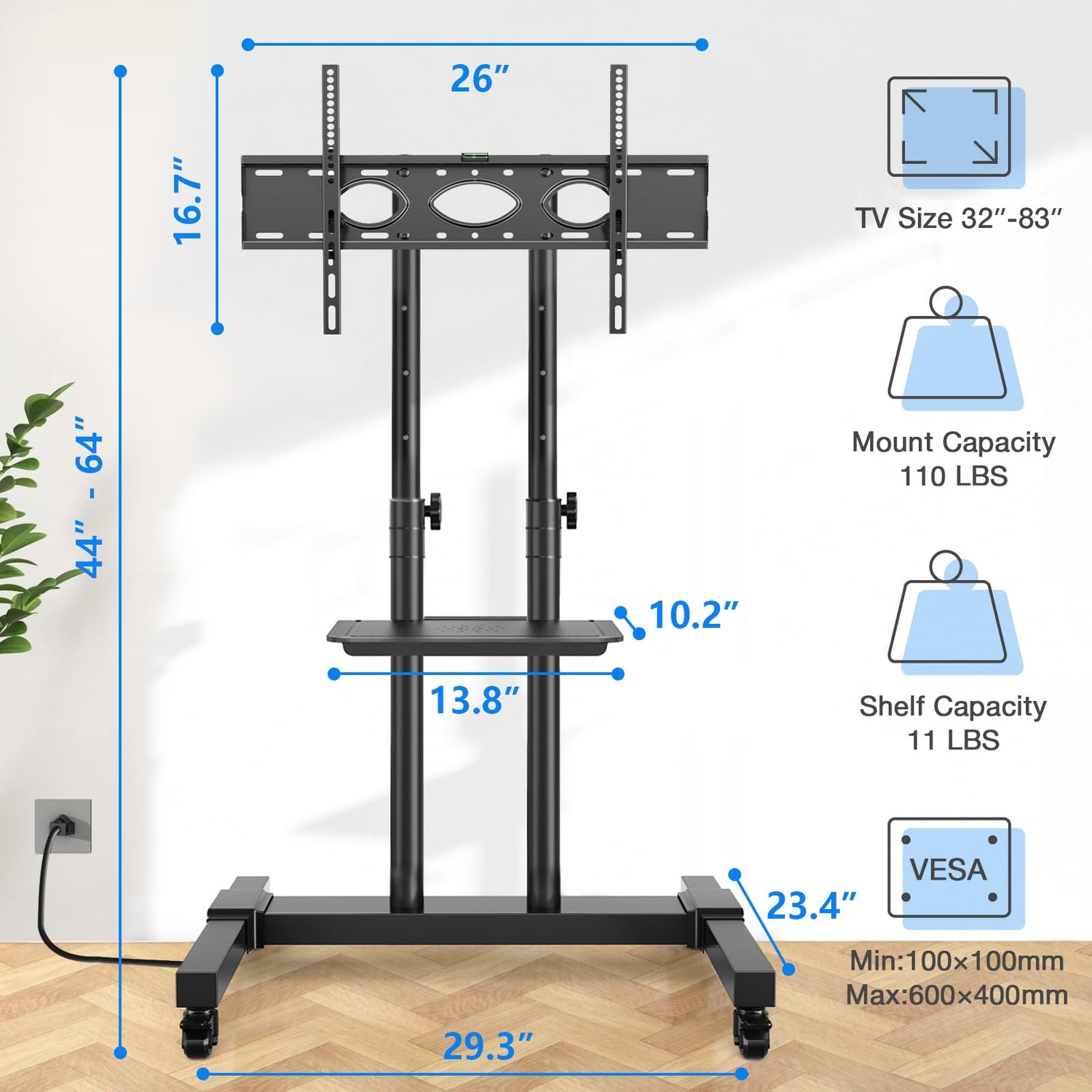 - UPGRADED ULTRA STRONG ROLLING TV STAND: Our rolling TV cart is completely made of steel, very sturdy and stable construction; It can securely hold up to 110 lbs; Providing more stable support for your TV; It fits most 32" to 83" flat or curved LCD/LED/OLED TVs, including brands such as Samsung, TCL, Sony, LG, Sharp, Vizio, etc; With a maximum VESA size of 600 x 400 mm; It serves as an excellent choice for enhancing your entertainment experience